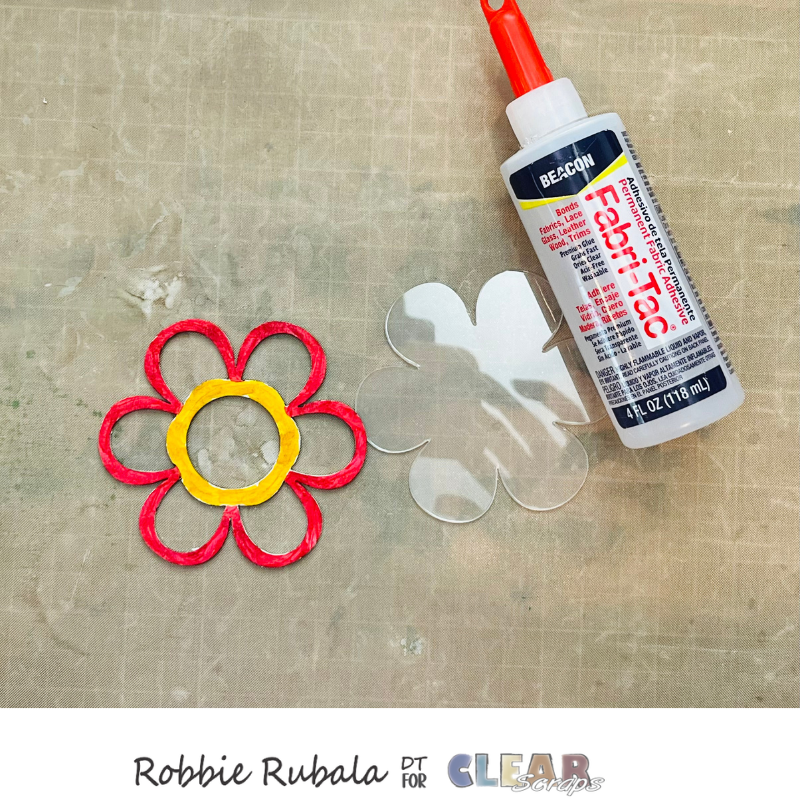 Remove the plastic protective film from the acrylic shape. Use a strong glue to add the colored flower to the acrylic shape making sure to keep the glue around the edges and not on the acrylic center. Once you have glued the shapes, place a heavy block on top to ensure the image and acrylic shape stick together with no gaps.