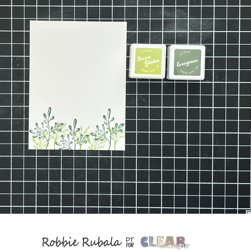 To create your card base, take the 3 7/8" x 5 1/8" white panel and use 2 leaf sprays and 2 green inks to create a border at the bottom of the panel.