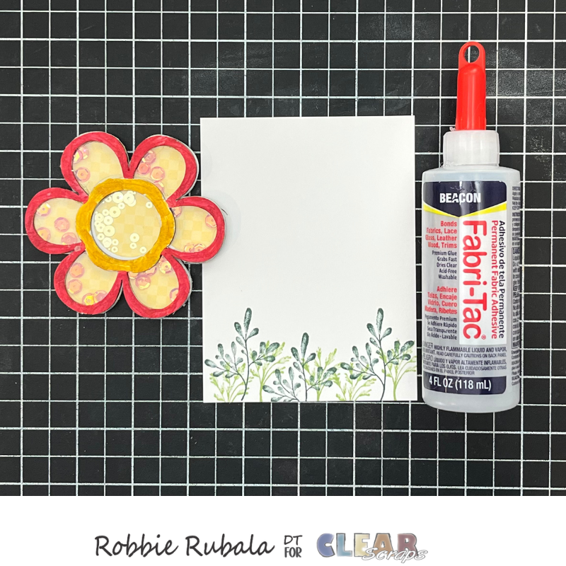 Once you have the foam strip around the circle in the center and the petals add some sequins in each section. Use a strong adhesive to glue the top of the shaker card to the bottom. Then set aside to dry.