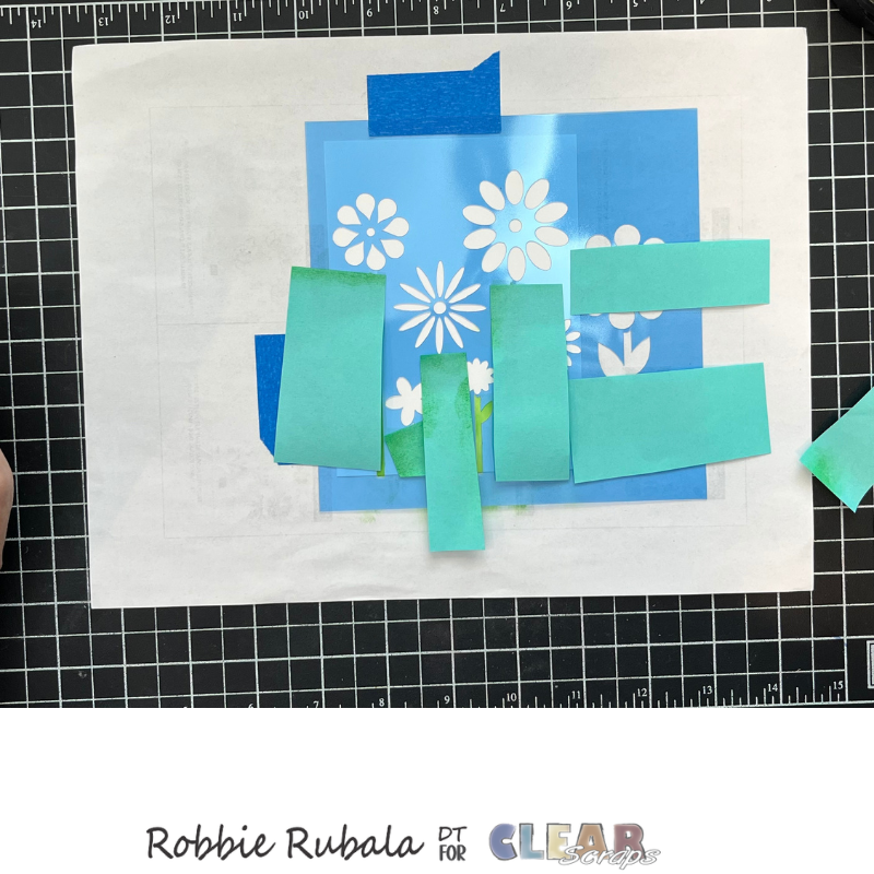 Take the 3 ¾” x 5” white panel and add some removable tape to the back. Stick it down on your work surface. Place the stencil where you want it on the panel and tape it to your work surface at the top and side.