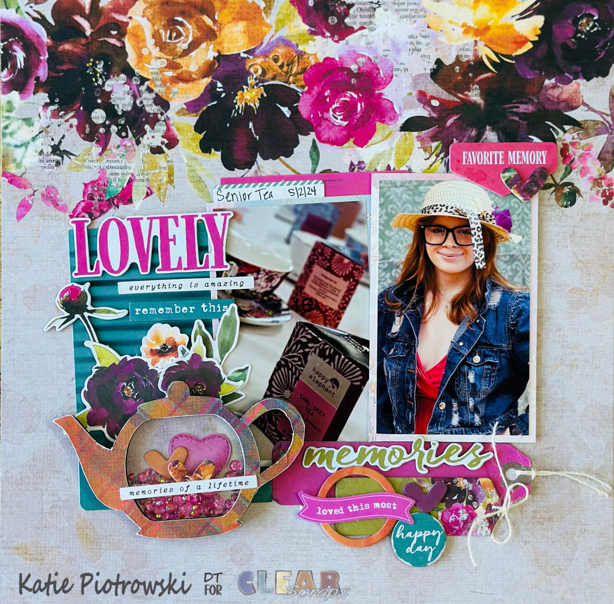 Graduation season is in full swing, and it's hard to believe it's already been a year since my daughter graduated in 2024! As I’ve been reminiscing, I decided it was the perfect time to finally create a layout featuring one of my favorite memories—her Senior Tea Party, a sweet celebration hosted by her teachers just before the big day. The Clear Scraps Teapot Shaker felt like the perfect embellishment to capture the elegance and charm of the occasion.