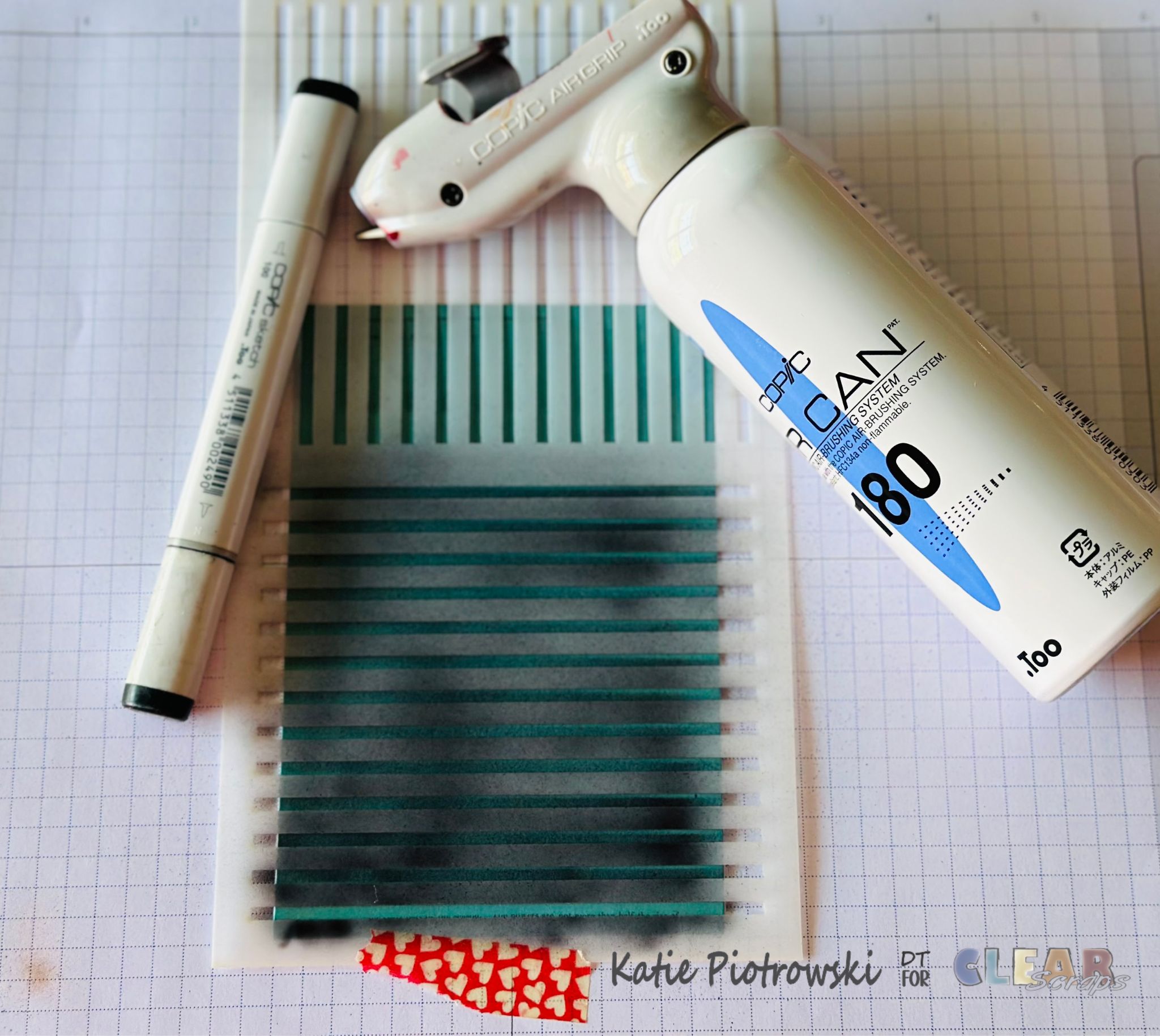 After selecting my background paper, I was drawn to the teal cardstock and originally planned to create a journaling block using the 5×9 Stripes Stencil. To get started, I placed the teal paper on top of a sheet of grid paper and secured the stencil with washi tape. Then, I used my Copic Airbrush can and marker to airbrush over the stencil. I love how the airbrushed lines created a soft, distressed effect—just enough texture without overwhelming the page.