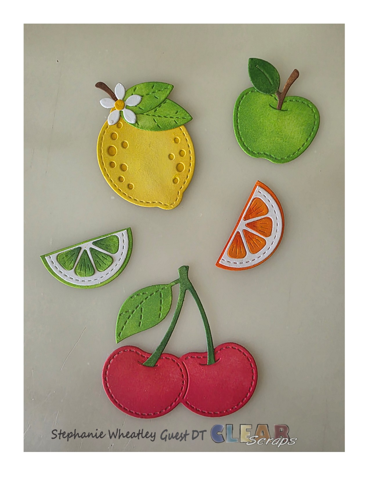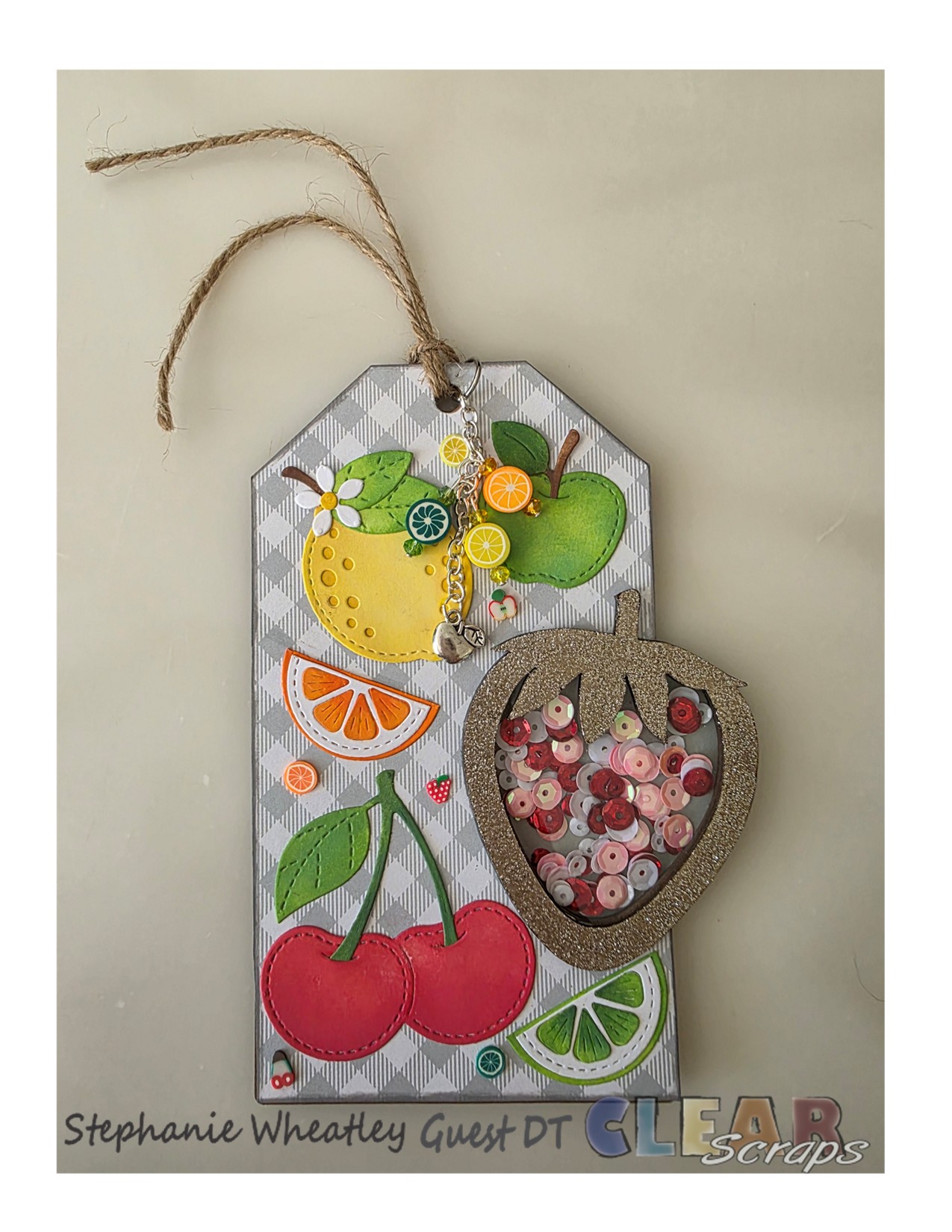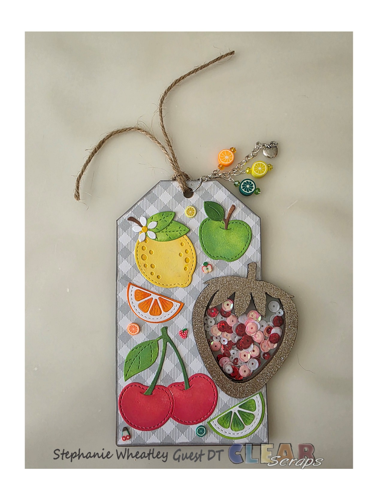 Prepare decorative elements. For my tag I used various fruit dies from Lawn Fawn. I die cut the fruit images from white cardstock and ink blended each piece with Distress Oxide Inks.