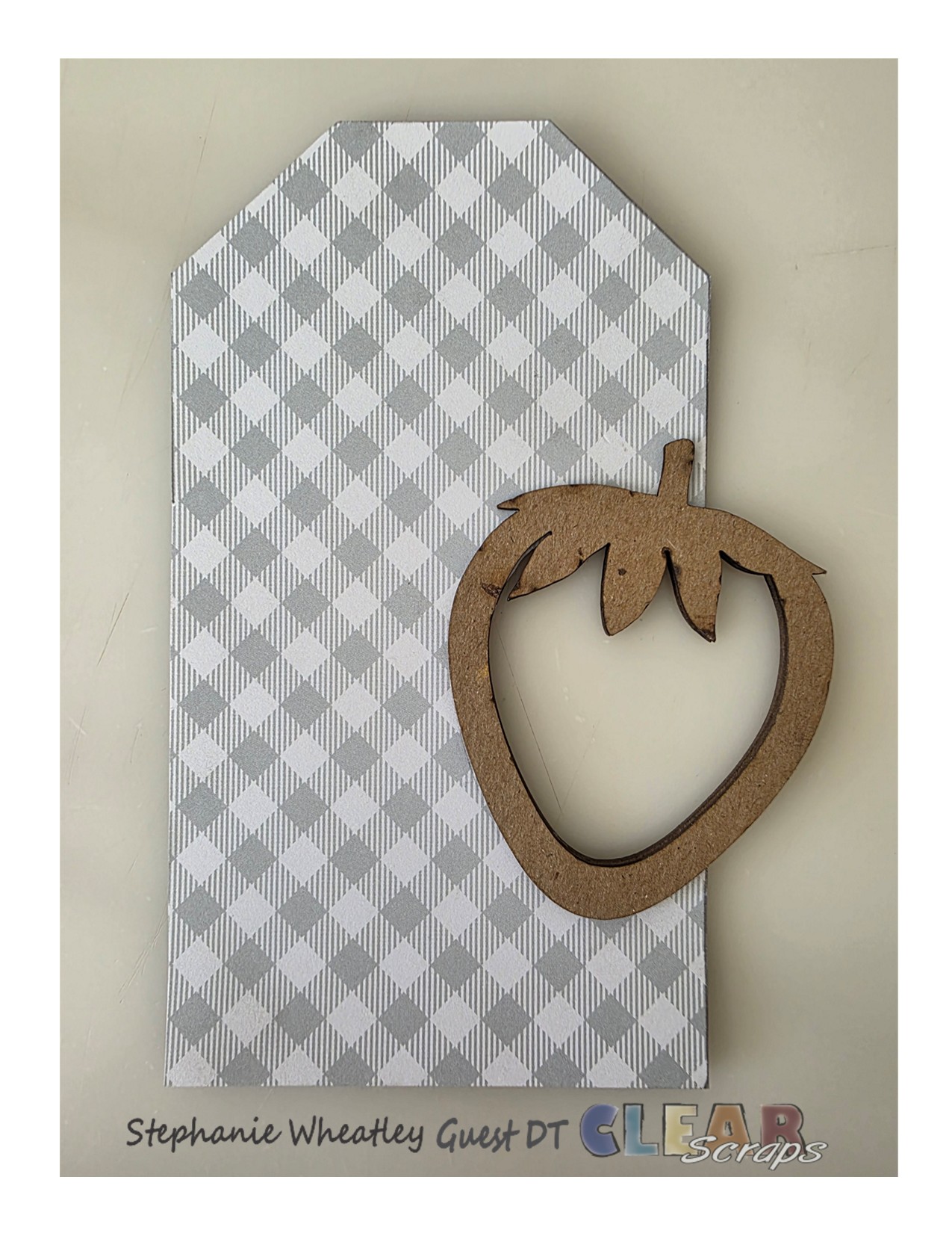 Cut cardstock of choice in the same shape as the strawberry shaker tag. Adhere the cardstock to the front of the tag. Using liquid adhesive allows for a few seconds to move the cardstock into the exact desired position.