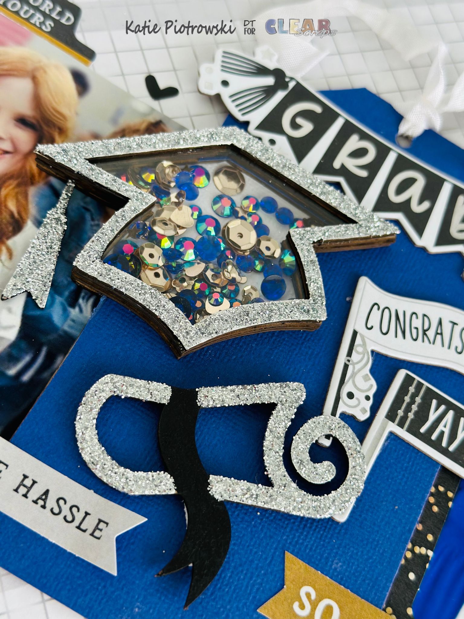 I wanted this layout to really celebrate the day, and the Clear Scraps Shaker Tag Grad Hat was the perfect centerpiece. I started by covering the tag with a cardstock that matched her school colors. After securing the backer piece, I filled the shaker with a mix of blue and gold sequins and gems. Once the shaker was fully assembled, I added silver glitter to the outside chipboard hat for a little extra sparkle — because if you know me, you know I LOVE sparkle!
