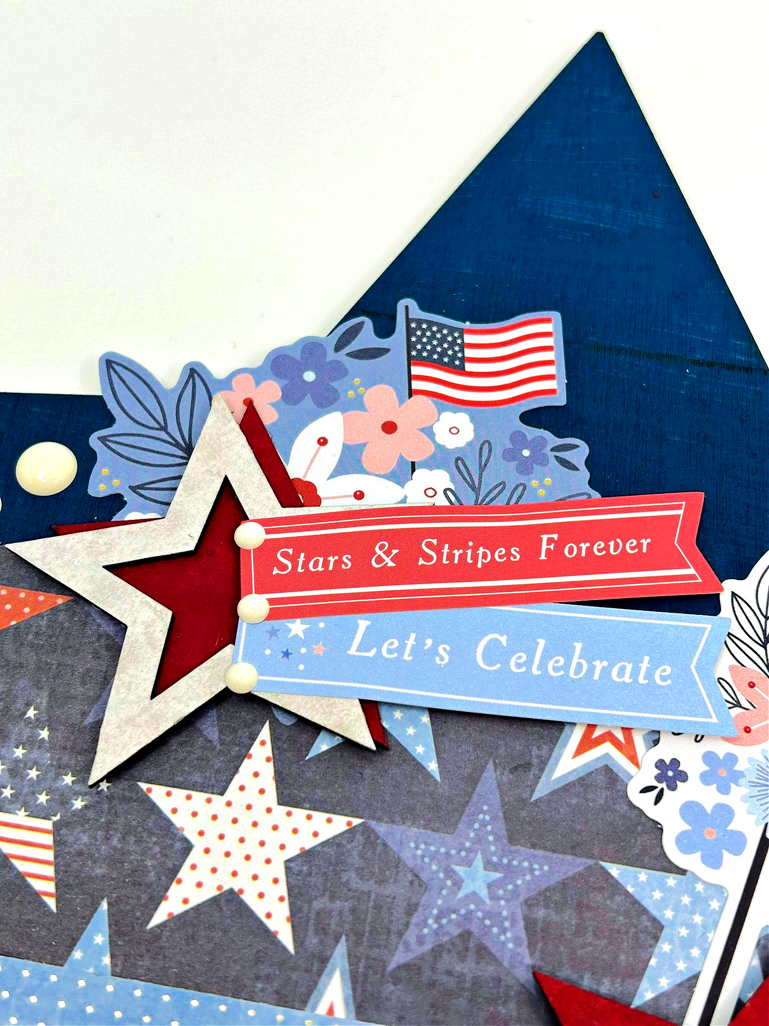 Other: Acrylic paint–red, white, blue, American Crafts Flags & Frills paper, ephemera, enamel dots, foam tape.