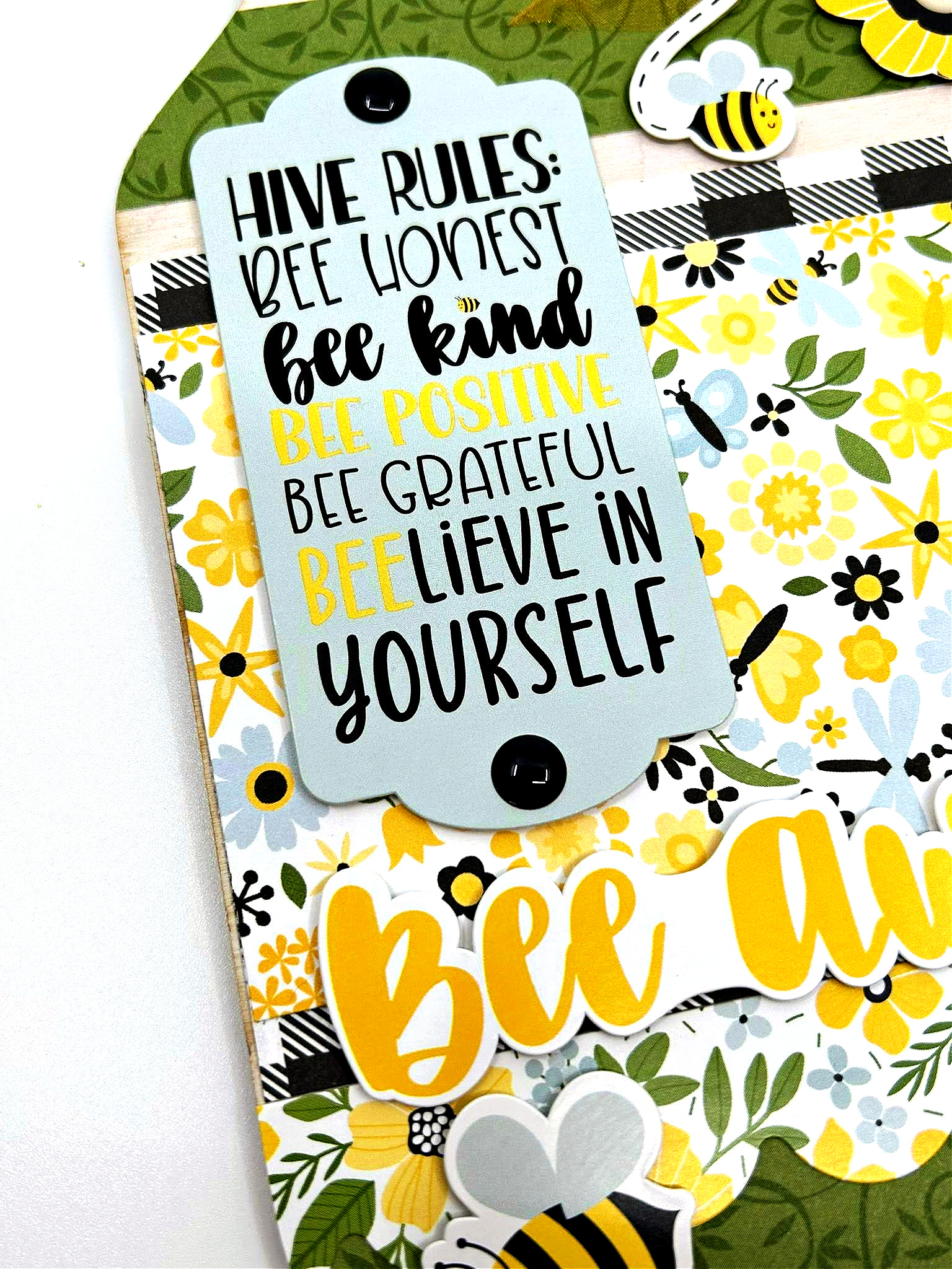 Other: Acrylic paint–black, white, Echo Park Paper Bee Happy collection papers & stickers, enamel dots, organza ribbon, twine, foam tape.