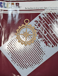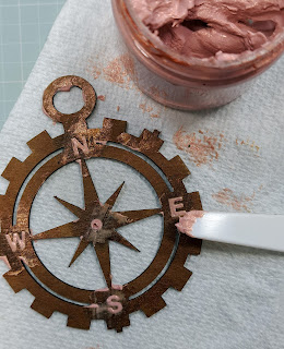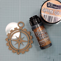 Step. 2 - I applied some Distress Stain in Brushed Corduroy and Brutus Monroe Chroma Glaze in Copper to the Clear Scraps: Chipboard Compass Embellishment. Making sure to fill in the center and the direction letters with the Chroma Glaze.