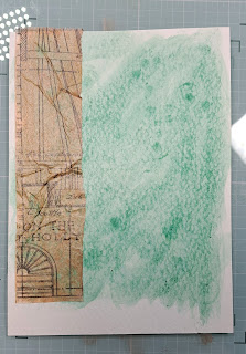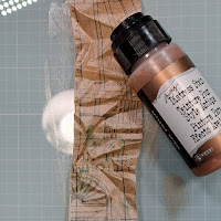 Step. 1 - I started by applying some Distress Stainin Weathered Wood onto the watercolor cardstock. Then, I applied Distress Stain in Antiqued Bronze onto an 1" strip of the tissue paper. Set them aside to dry.