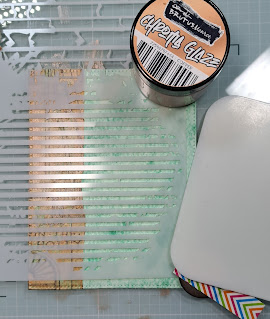 Step. 4 - I used the Clear Scraps: Grunge Brick 5×9 Stencil and Brutus Monroe Chroma Glaze in Copper on the Panel. Set it aside to dry about 5 minutes.