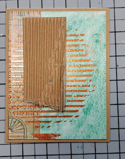 I adhered the stenciled watercolor panel onto the Kraft cardsrock. Then, I adhered the panel onto the card base. I adhered the coragated piece overlappeing the tissue paper area.