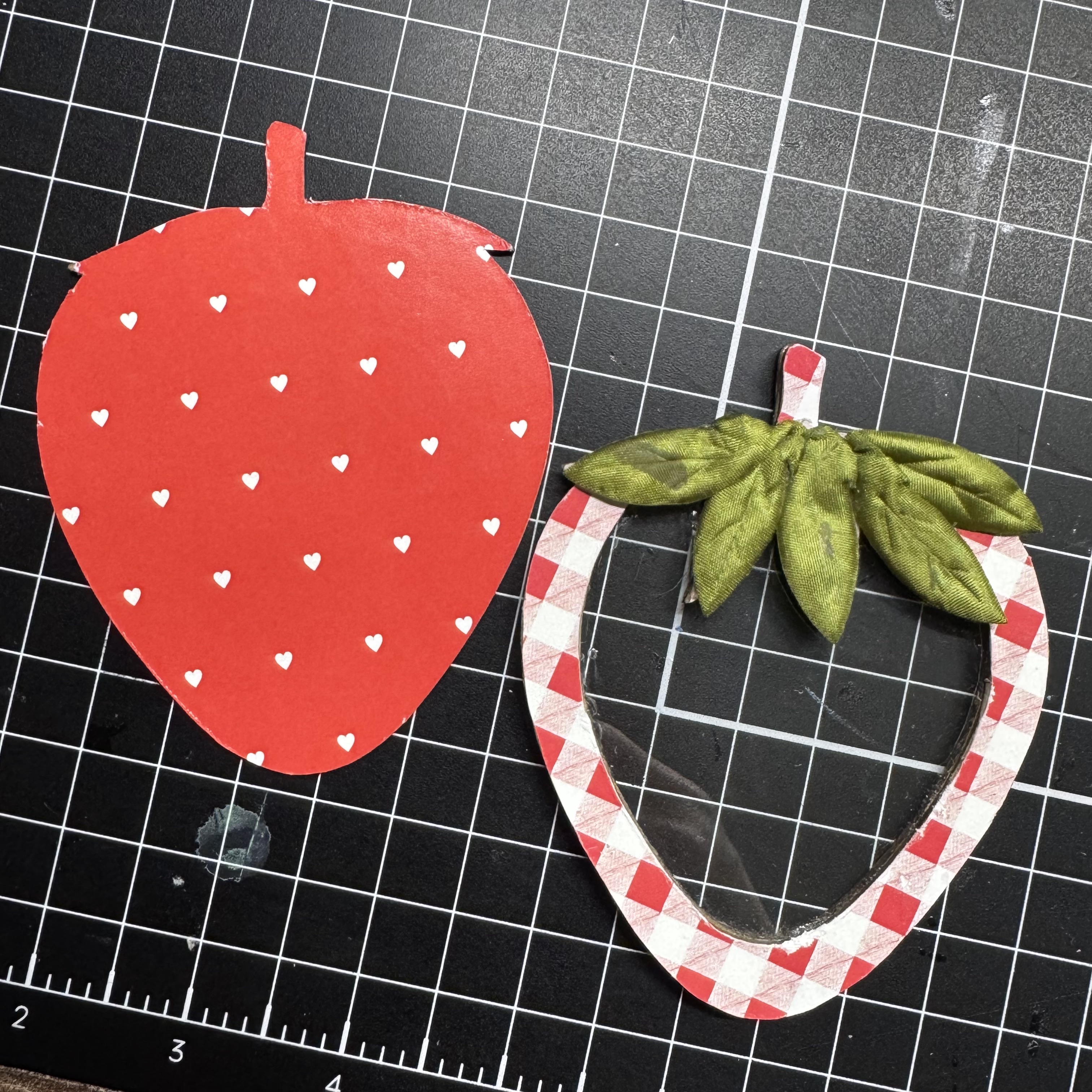 Once I had chosen the papers, it was time to assemble! As you can see in the photo above, that strawberry is all decorated with complimentary red papers and a leaf ribbon, and just needs to be filled. That is the best part! That is when I get to go through all the bits and pieces that I have and come up with the perfect mixture for the "filling".