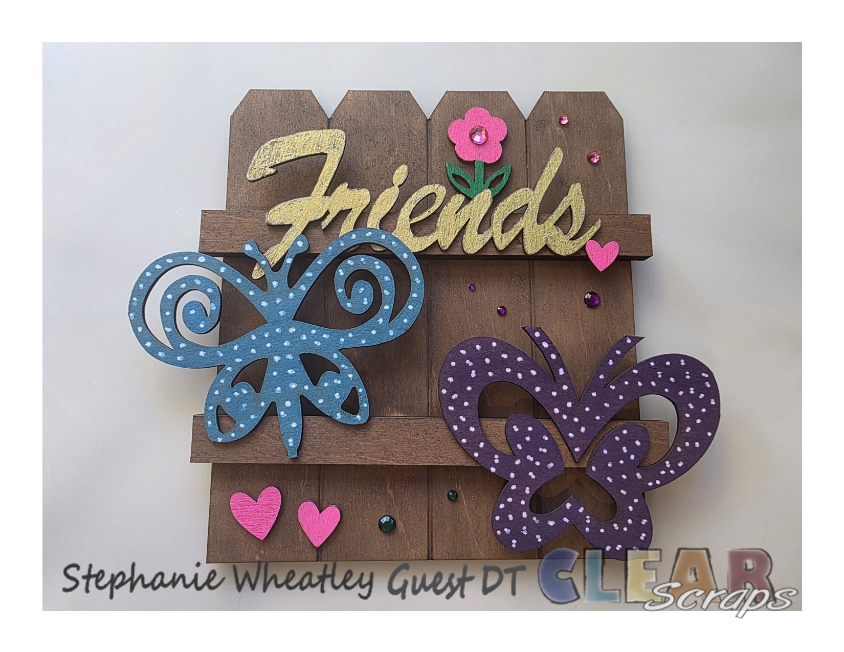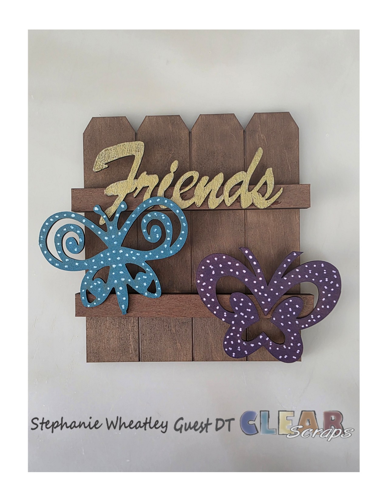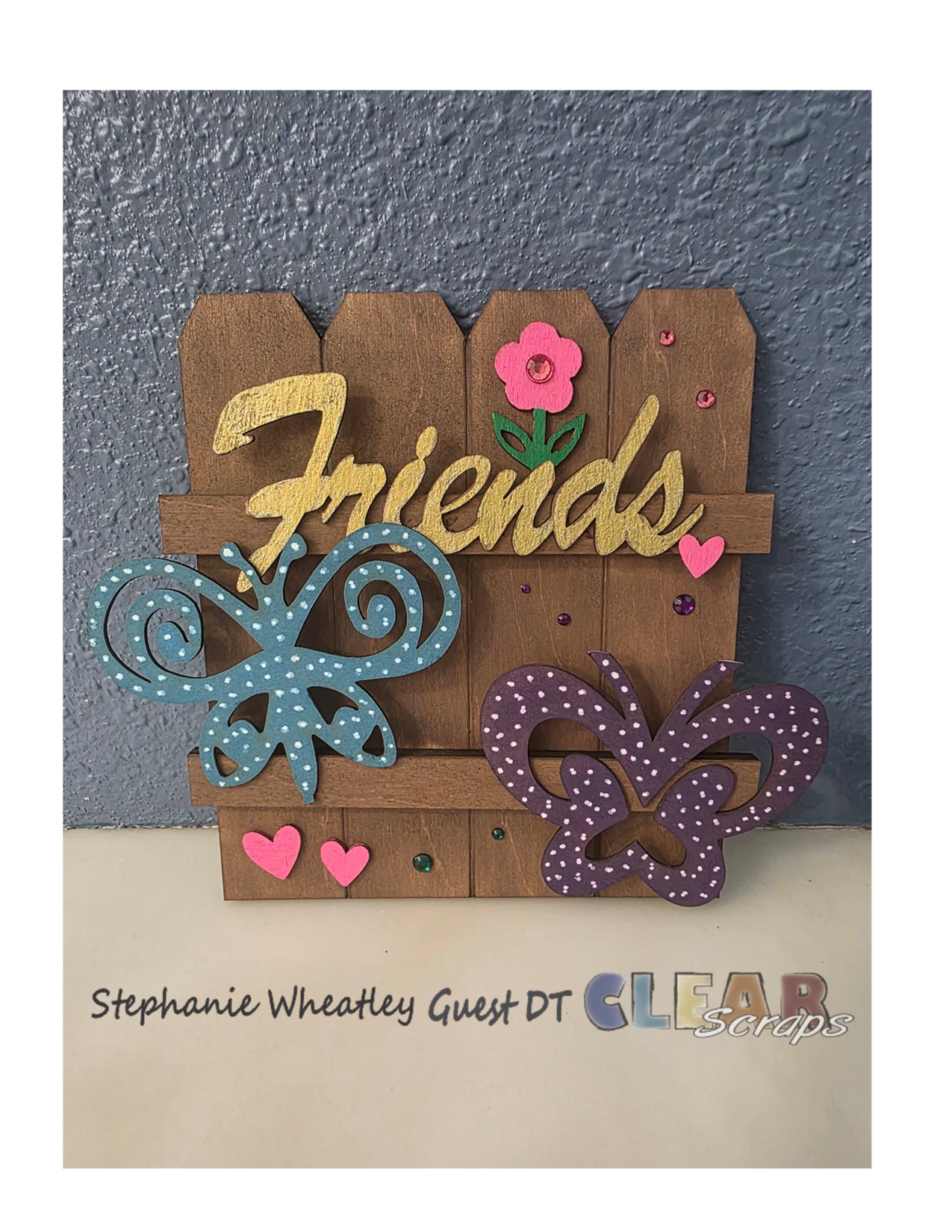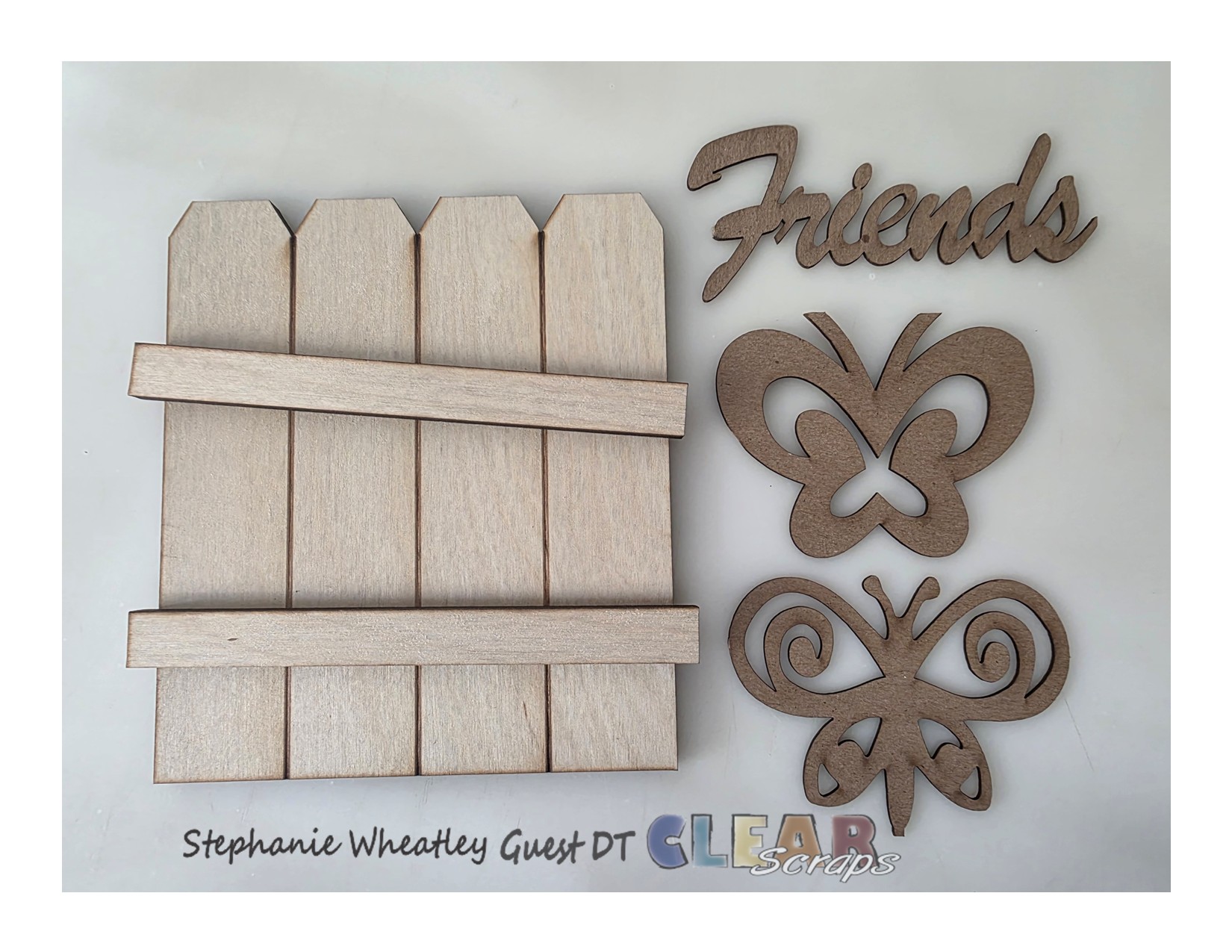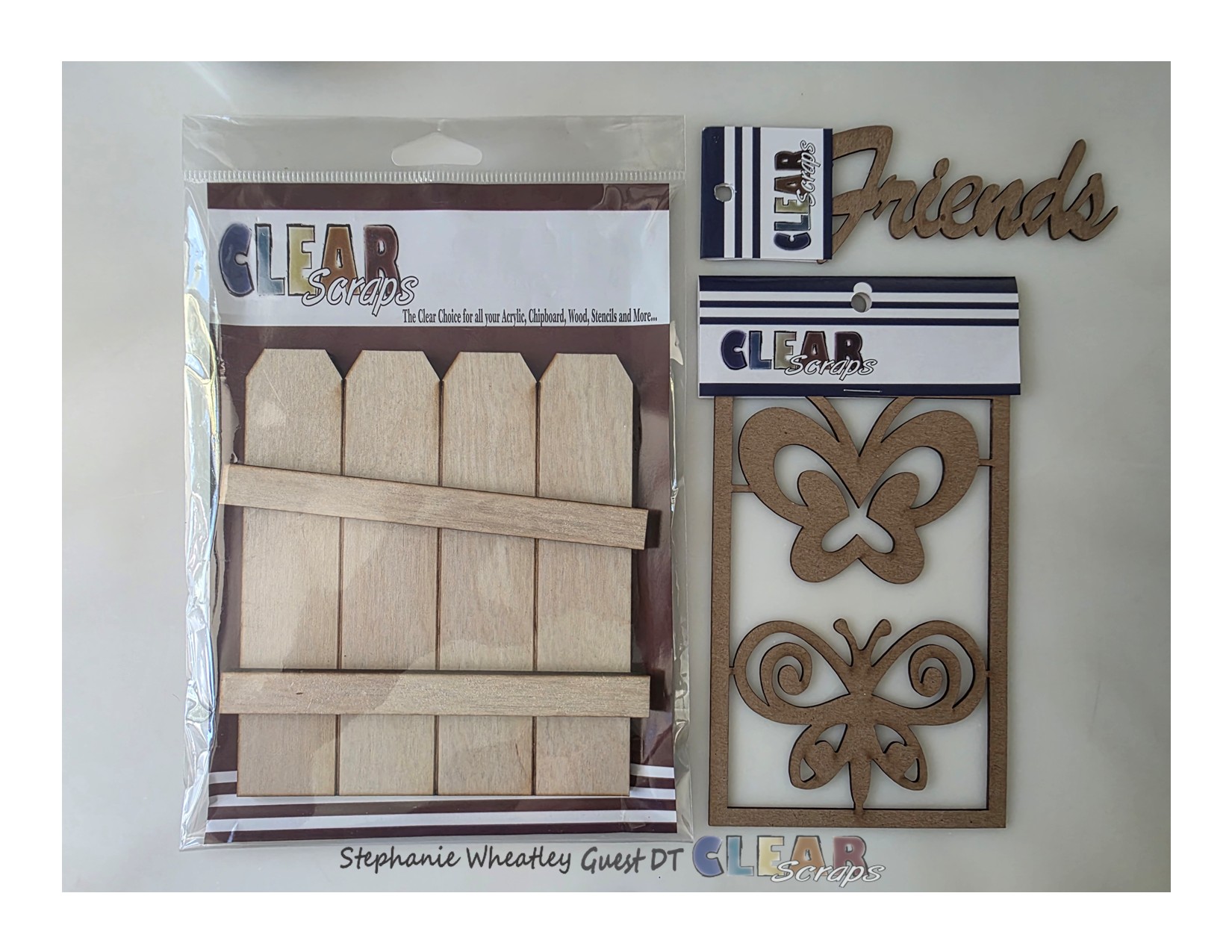 Hello Crafty Friends – I am excited to share the Clear Scraps small fence shiplap shape with you today. I enjoyed using the shiplap fence along with the swirl butterflies chipboard embellishment, and friends chipboard word title to create this fun decoration. Clear Scraps chipboard elements are easy to use. All the pieces are pre-cut for easy assembly. The shiplap fence is a great size to use as an embellishment or a décor piece.