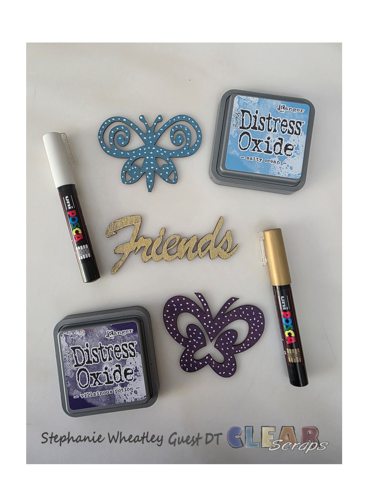 Add color to the butterflies using Distress Oxide Ink and a blending tool. For a blue butterfly, use salty ocean. For a purple butterfly, use villainous potion. To add white detail to the butterflies, use a Posca paint pen in white. Add color to the friends word using a Posca paint pen in gold.