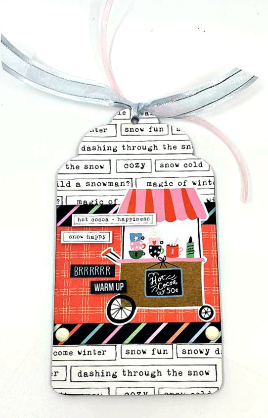 One of the tricks working with the acrylic tags–use the same "base" piece (note the paper across the middle) and work within that space so you have the same "look" on both sides. Since it's see through you need to keep that in mind. If you add an element like the tag piece I did along the top edge–make sure you do that on BOTH sides so nothing shows through.