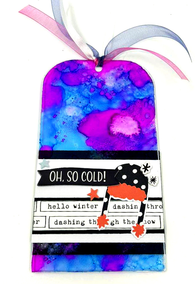 Next up–NEW acrylic tags too! The Acrylic Rounded Tags are really fun to play with! You could leave them clear and just use paper. You could stamp on them with a Staz-On type ink. Here I used alcohol inks.