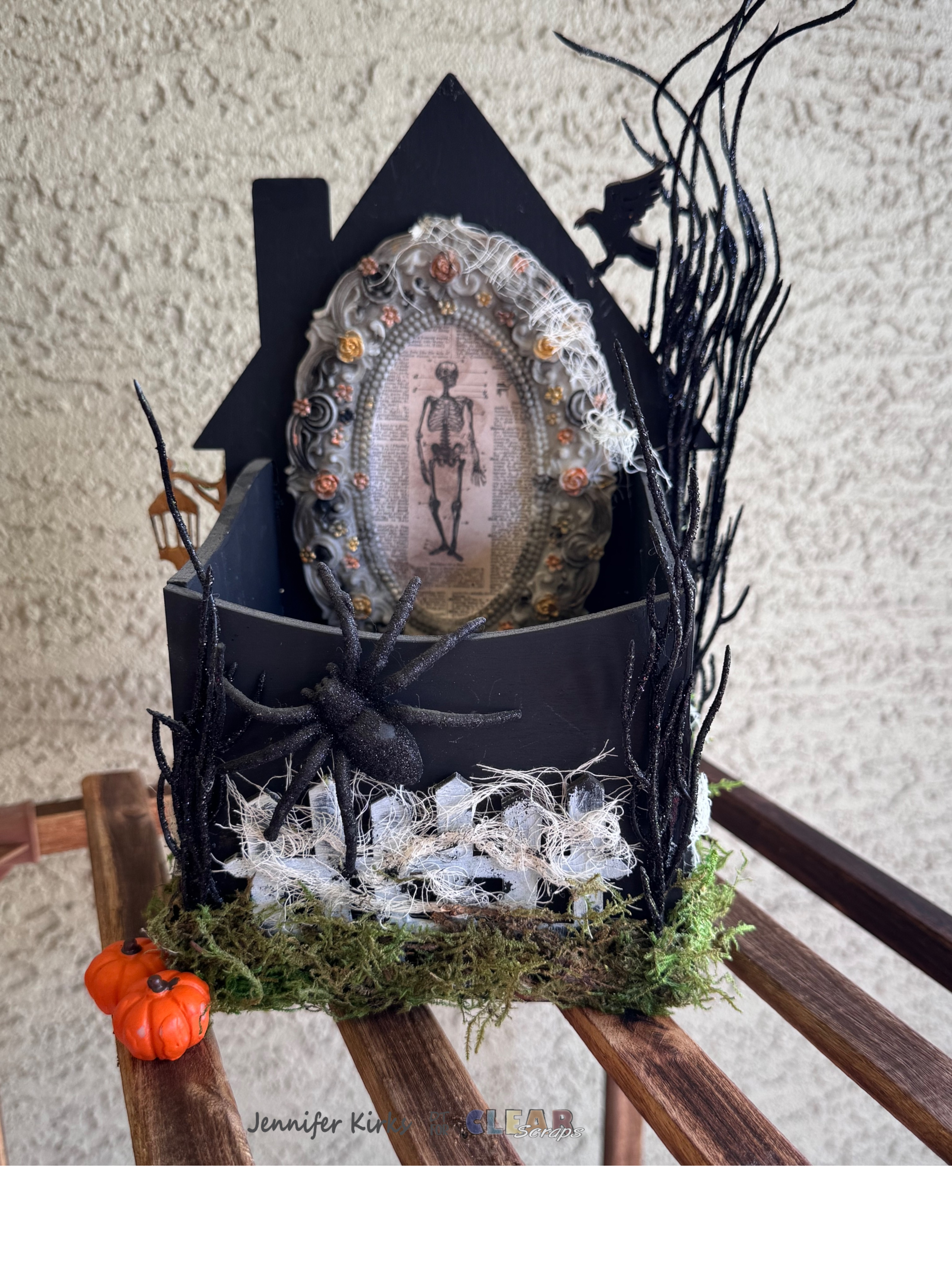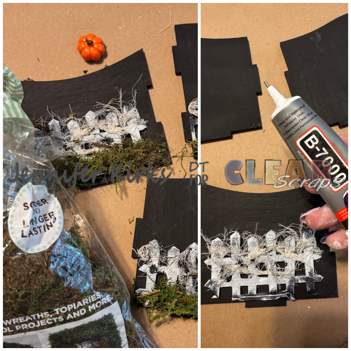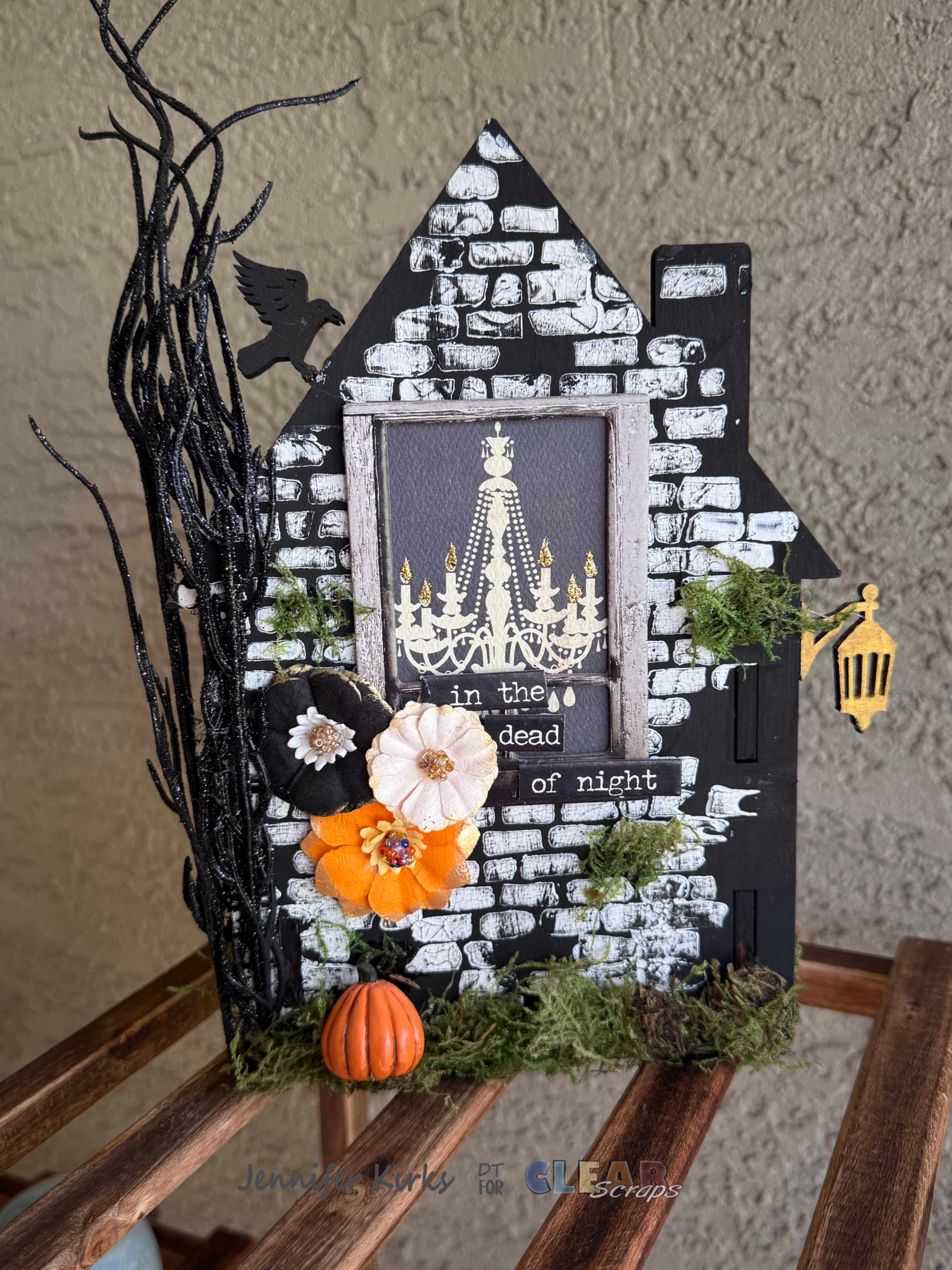 To assemble, I used B7000 glue to attach the fence pieces to the sides and back of the box, and added moss along the fence line. After that dried, I glued the main box together. For the front of the house, I added a frame and a chandelier image to give it a "window" look, and filled in the brick wall with more moss, flowers, and a little pumpkin.