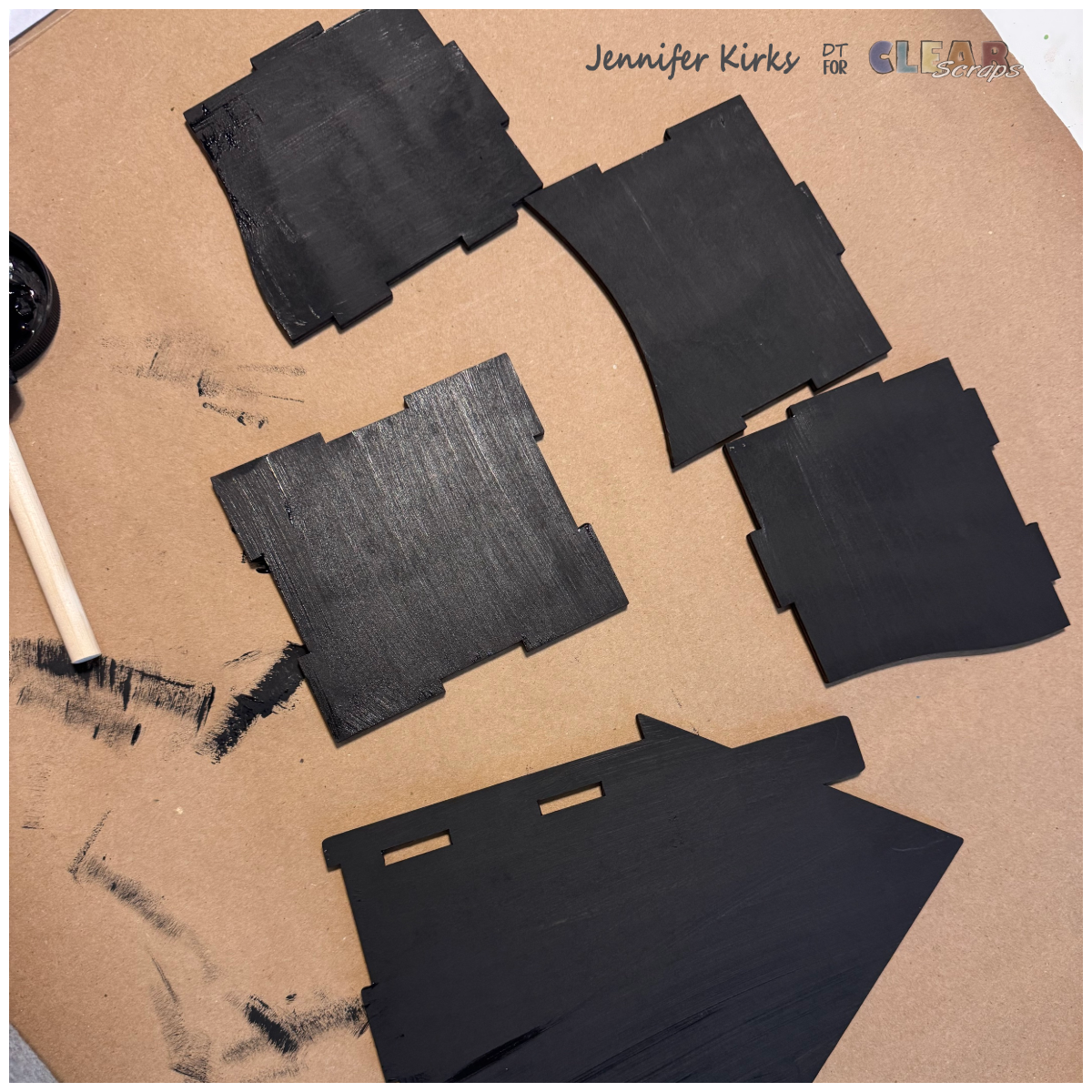 To start, I painted all the box pieces—front and back—with black chalk paint. I love using chalk paint because it dries quickly and gives a smooth finish, but acrylic paint works just fine too.
