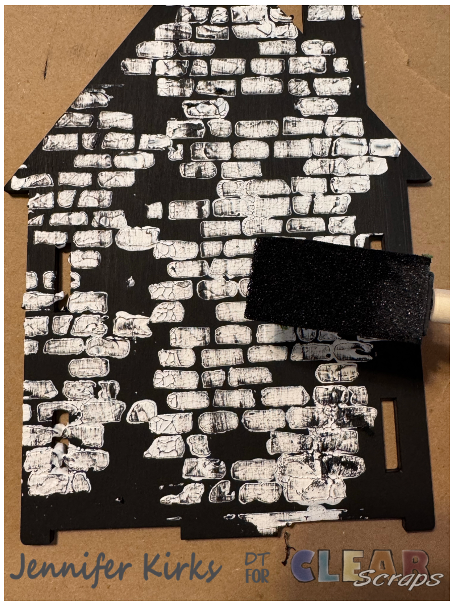 Once the paint dried, I took a brick stencil and clipped it to the side of the house-shaped portion of the box. I applied some crackle paste over the stencil to create a realistic brick texture—so fun to watch it dry! Once dry I brushed some black paint over the bricks to tone the white down a bit.