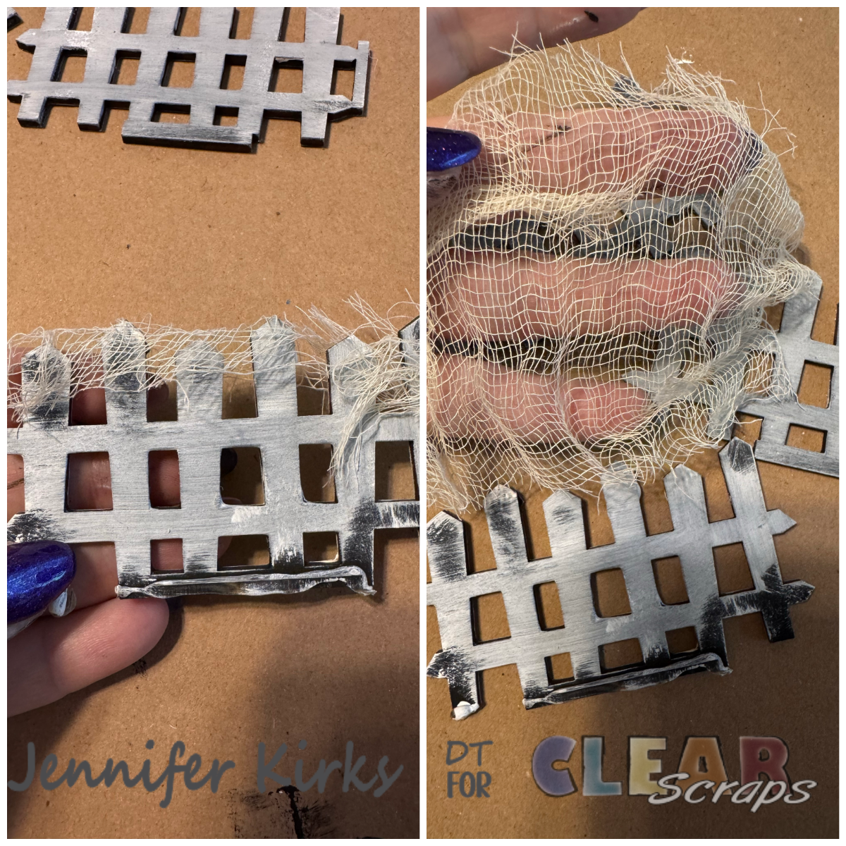 Next, I grabbed some wooden fence pieces I had previously painted white. I added a bit of black paint to give them a distressed look, and then draped some cheesecloth over them to create a spooky spiderweb or ghost-like effect.
