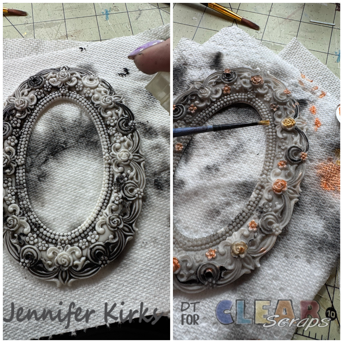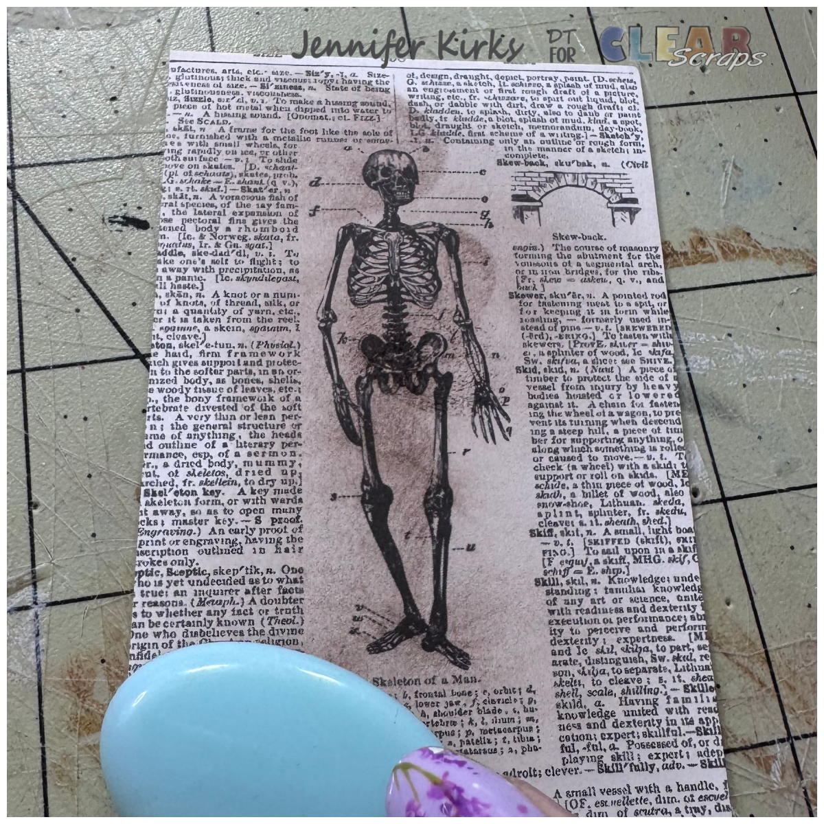 For the inside, I found an image of a skeleton I wanted to use. I carefully cut it out and added a bit of brown distressing ink to give it a vintage vibe. Then I painted a circular frame with black acrylic paint, sprayed it lightly with water so the paint could settle into the grooves, and left the top surface with a soft gray tint. Once that dried, I added gold and copper paint to some of the flowers on the frame for extra detail.