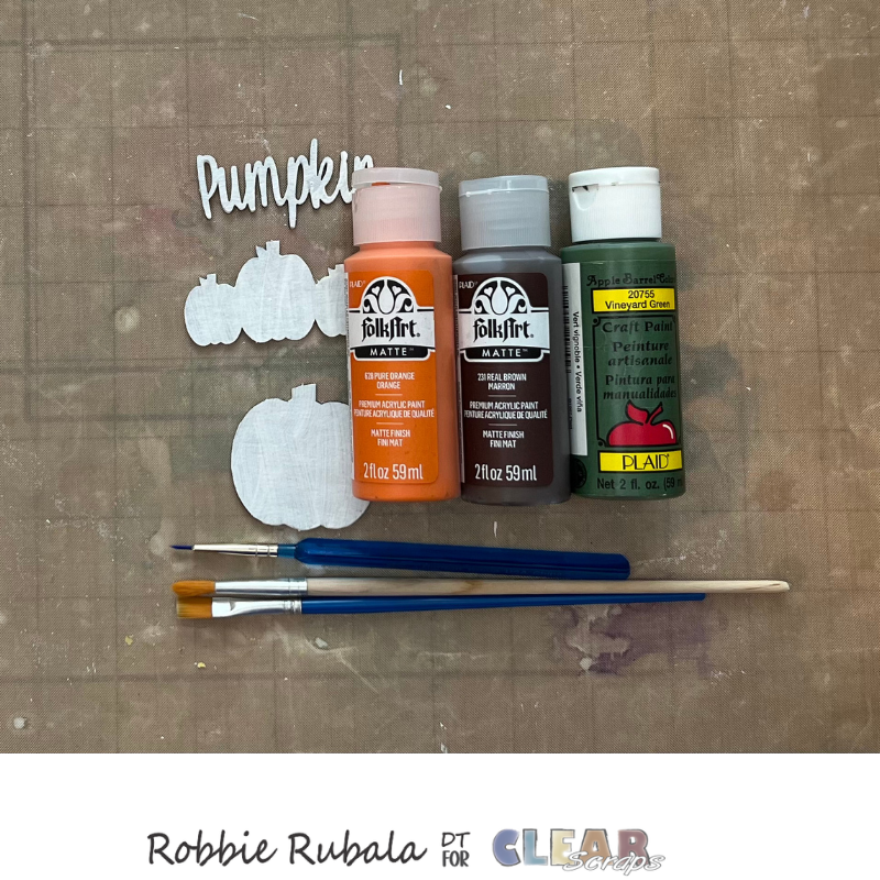 Once the Gesso is dry, we can begin painting. I chose the cluster of pumpkins, the single pumpkin, and the word pumpkin. I used orange, brown, and green acrylic paint.