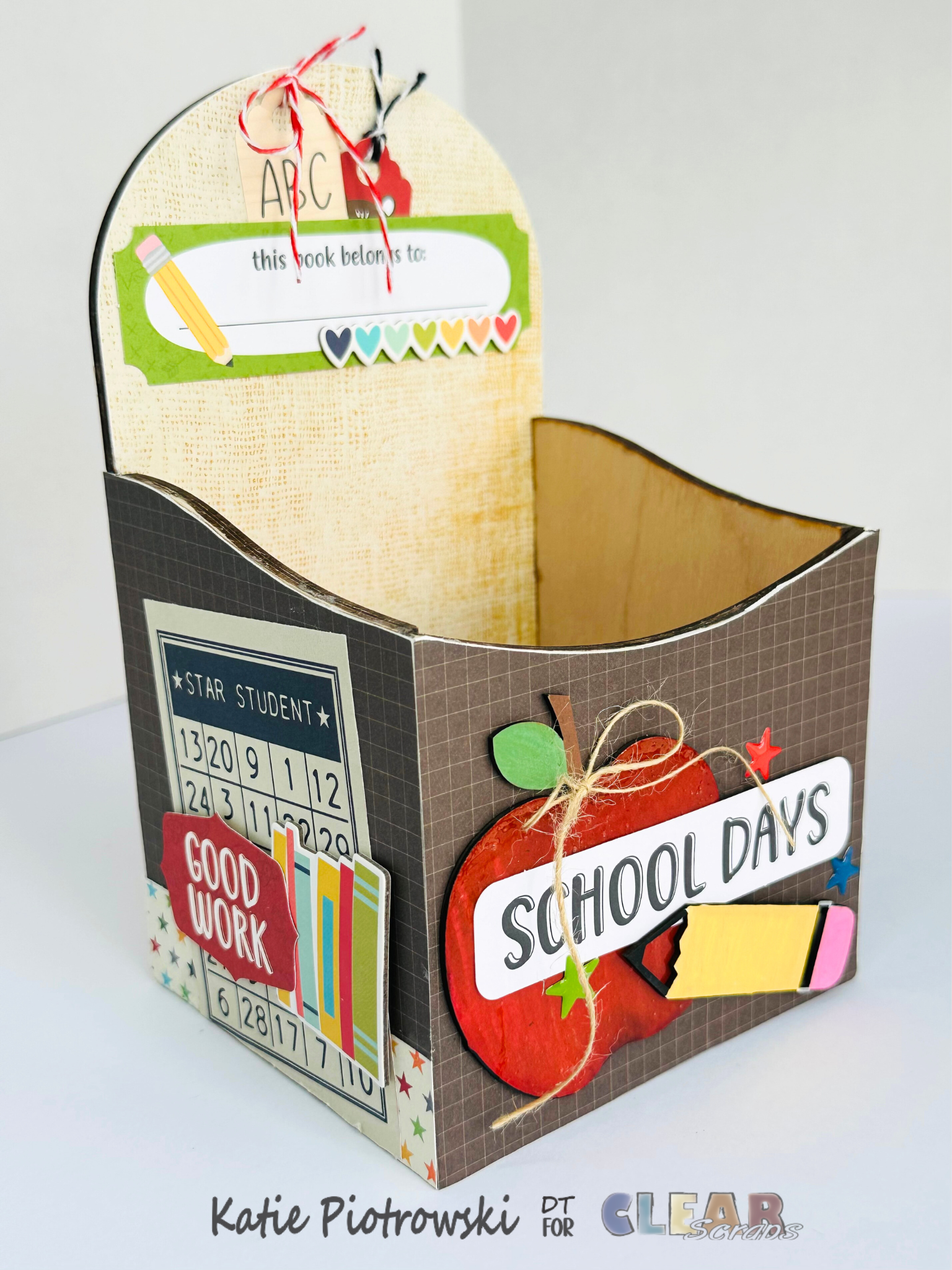To embellish the sides, I added a few cute 3×4 cards from my paper pack. The inside top features a “This Book Belongs To” label with a couple of tags tucked behind it, finished with a row of chipboard hearts. For the front, I used the new School Days Chipboard Embellishments—painting the pencil and apple with my favorite acrylic paint markers. I added a glossy finish to the apple with Diamond Glaze for that fresh-picked shine, tied a little twine bow around the stem, and layered the pencil over top. A few epoxy stars completed the look!
