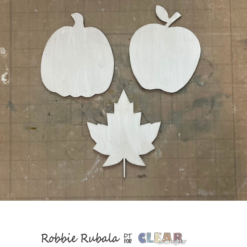 To begin use Gesso to paint both sides of the wooden shapes. Let dry completely.