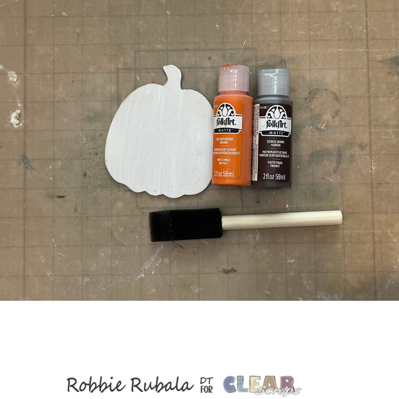 Take the pumpkin shape, the brown and orange paint, and a pencil. Use the pencil to in the bae of the stem. See photo below. Now paint the pumpkin and let dry completely.