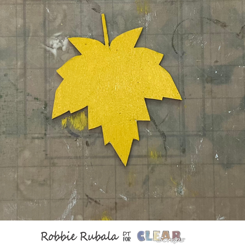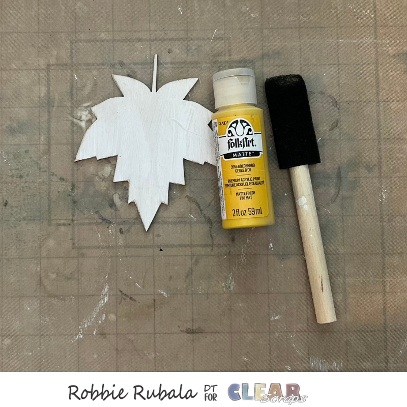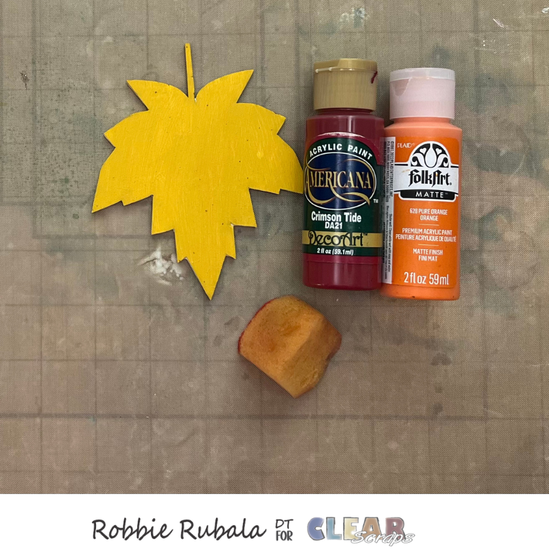 Take the leaf and the yellow paint and paint the leaf. Let dry completely. When the leaf is dry use a sponge and the red and orange paint and add sponging to give it a Fall leaf look.
