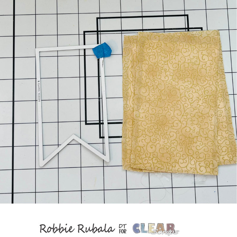 Begin by using the strong glue to attach the fabric to the cardstock. Let dry completely. When dry use the banner die to cut out the shape. Note – I ran the die through my forward and backward several times. Then I flipped it over and ran it through a couple of times again. The die may not cut the fabric all the way but you can use your scissors to finish the cutting.