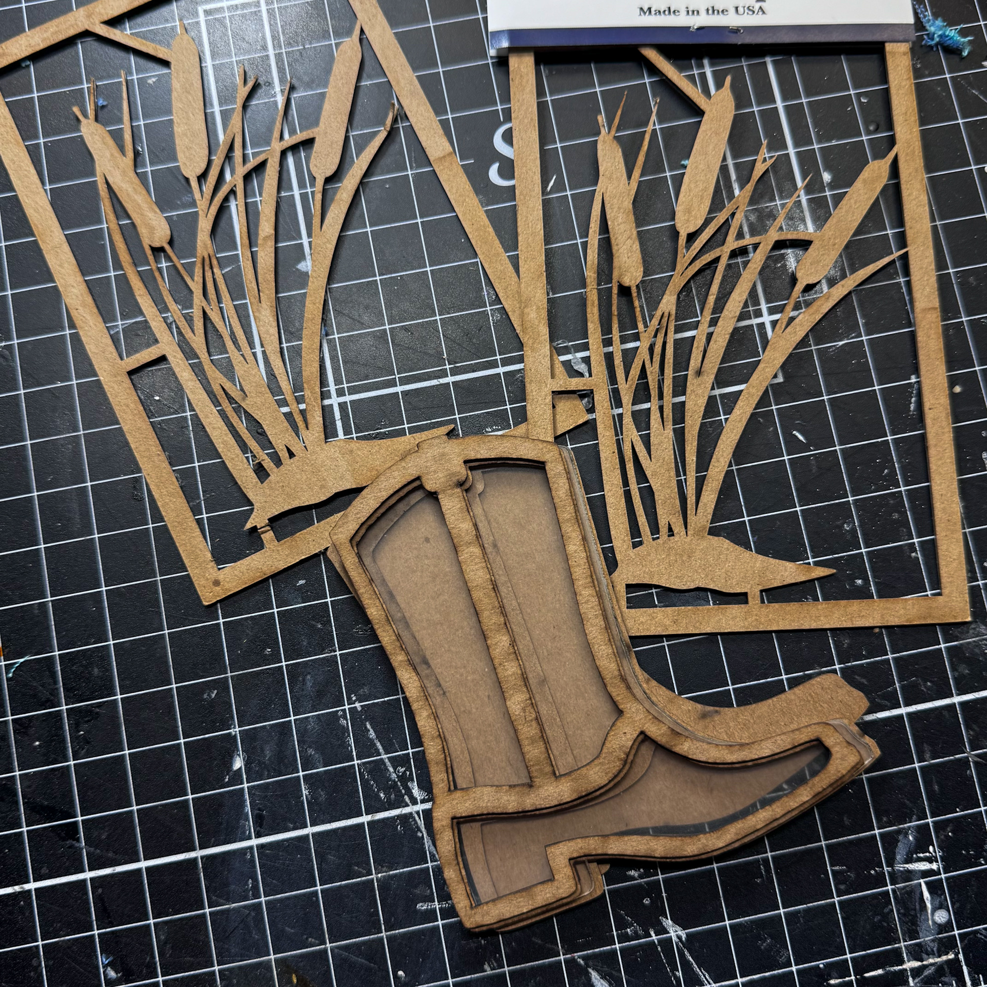 I started with the cowboy boot and the cattails chipboard. Can you guess where this is going?