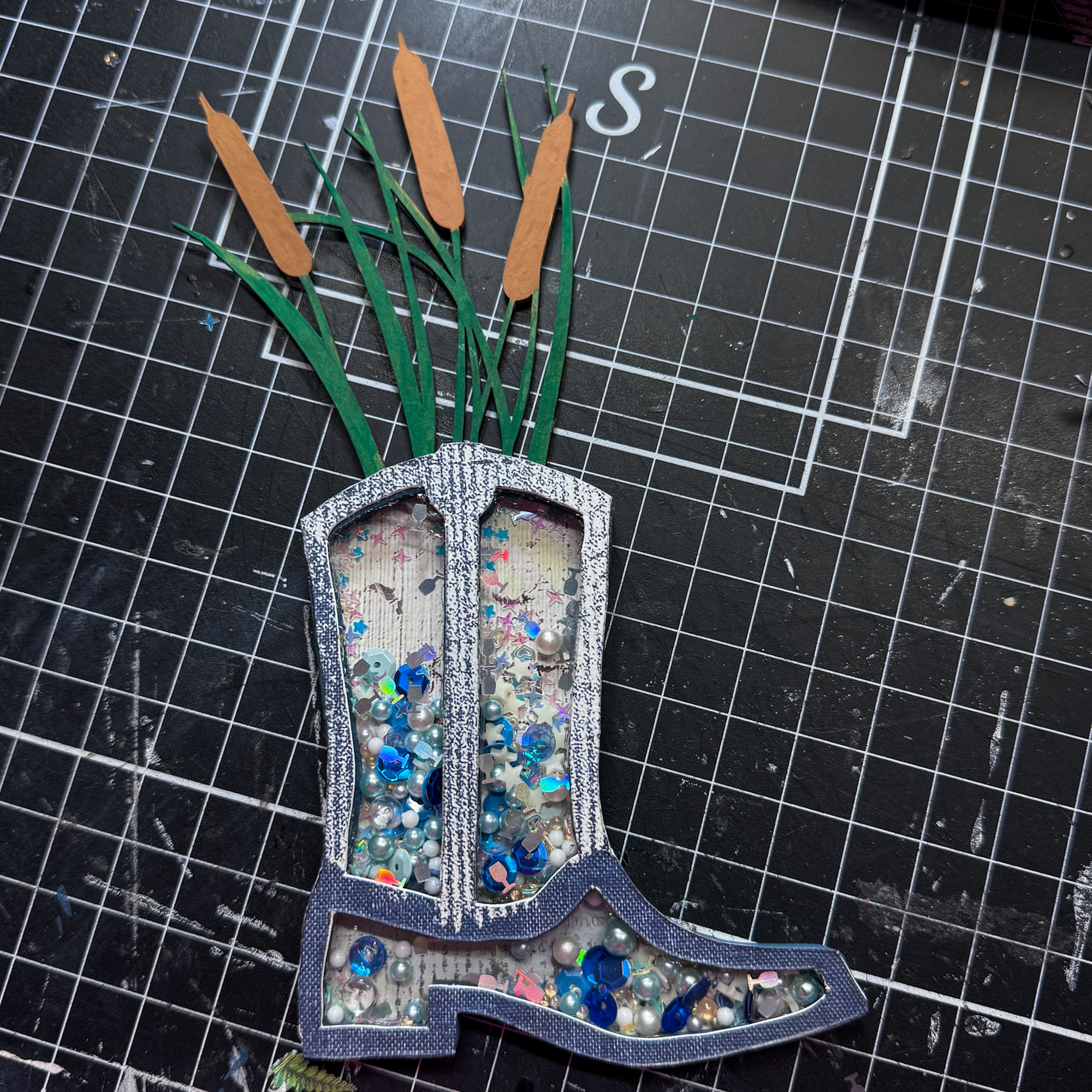 Once I got the shaker all put together, I added the cattails. I thought that I would want both sets of the cattails, but ended up only using one. I did not want to overload the boot and make it look top heavy. I just used regular acrylic paints to paint these, and then added the floral ephemera and twine.