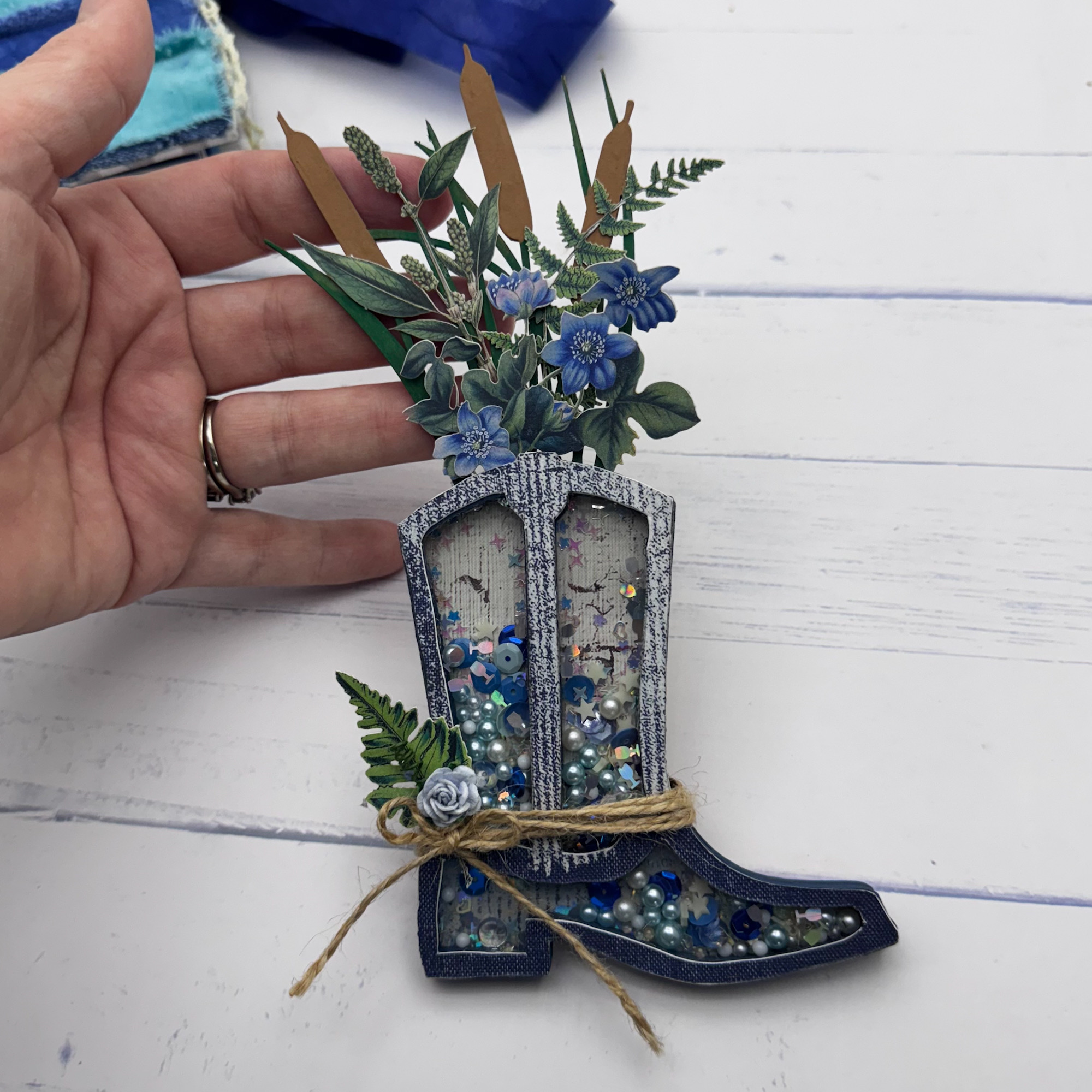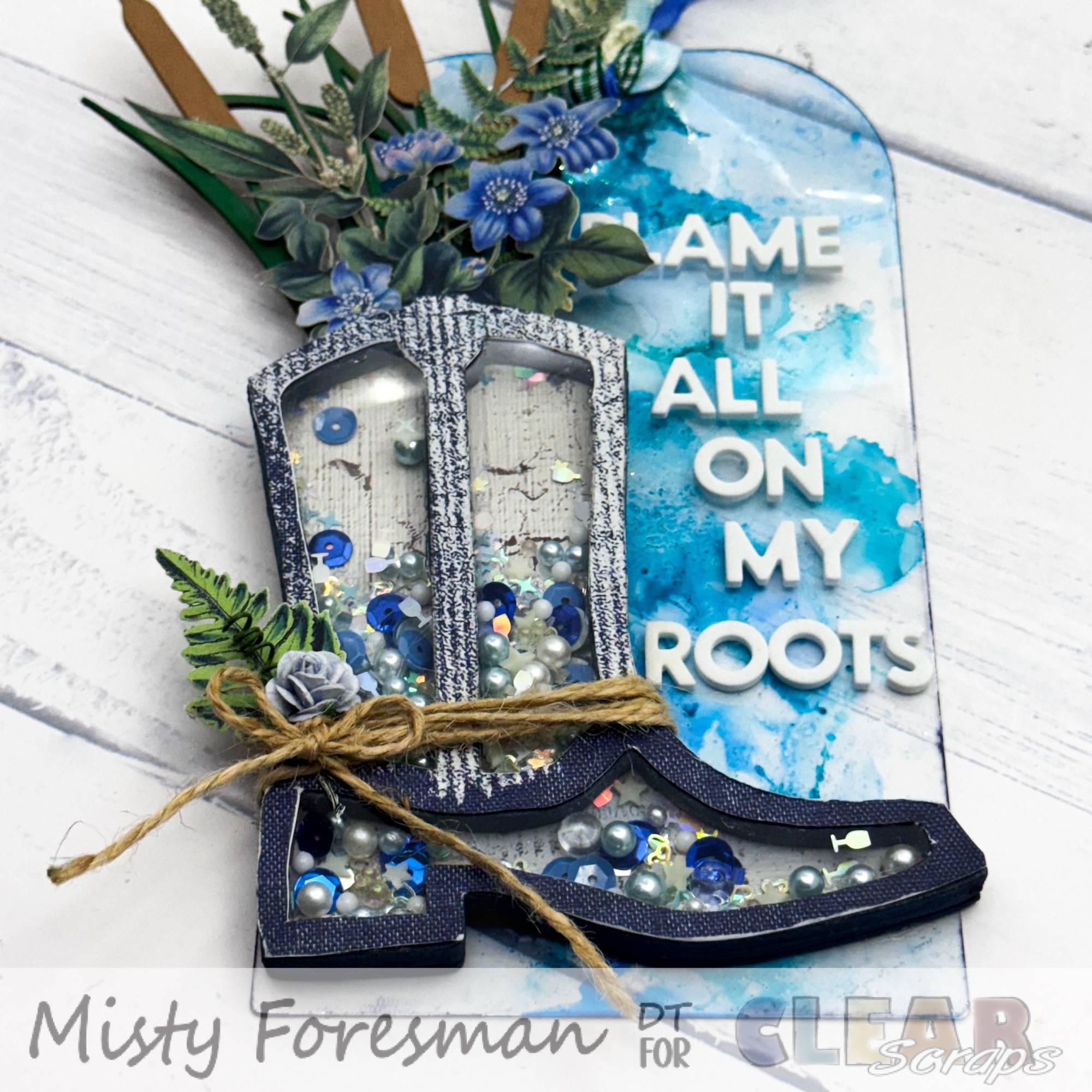 It was already beautiful, but I felt like it needed something more. I pulled out one of the new Acrylic Tags with Rounded corners and “tested the waters” so to speak. I LOVED the way it looked, so I "painted" the acrylic tag with alcohol inks in various shades of blue, and then added one of my favorite sayings/song titles. THAT was it. THAT was what this project needed! My heart was happy! Blame It All On My Roots! I love Cowboy Boots! HA HA HA!!