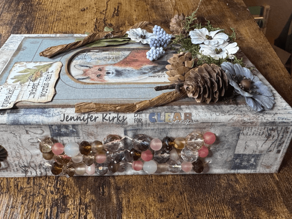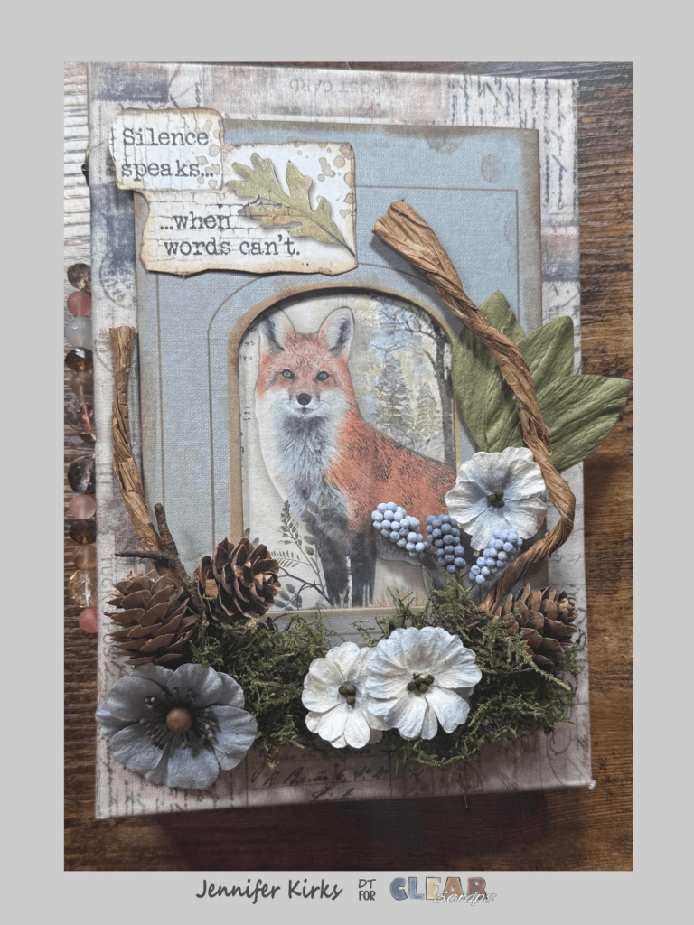 To finish the journal, I decorated the front cover with a chipboard frame, flowers, moss, and a fox image—a perfect nod to the nature theme.