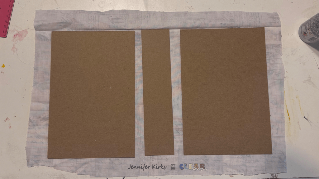 To begin this journal, I started by covering the chipboard covers with a piece of fabric from my stash. I cut the fabric about an inch larger than the chipboard on all sides so I could fold it over to create a clean, wrapped cover. I laid out the three pieces—front, back, and spine—on the fabric to make sure everything lined up correctly, then used 3-in-1 glue to adhere the chipboard pieces to the back side of the fabric.