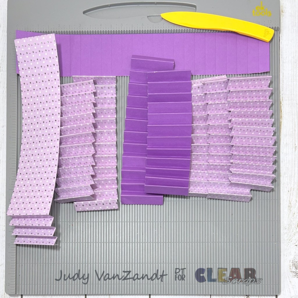 Cut strips 3 strips of cardstock about 1.5″–2″ wide and score every 1/4” or 1/2” to create accordion folds. My strips measure 2” wide x 11” in length, scored every 1/2”.