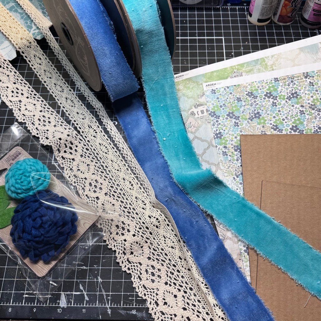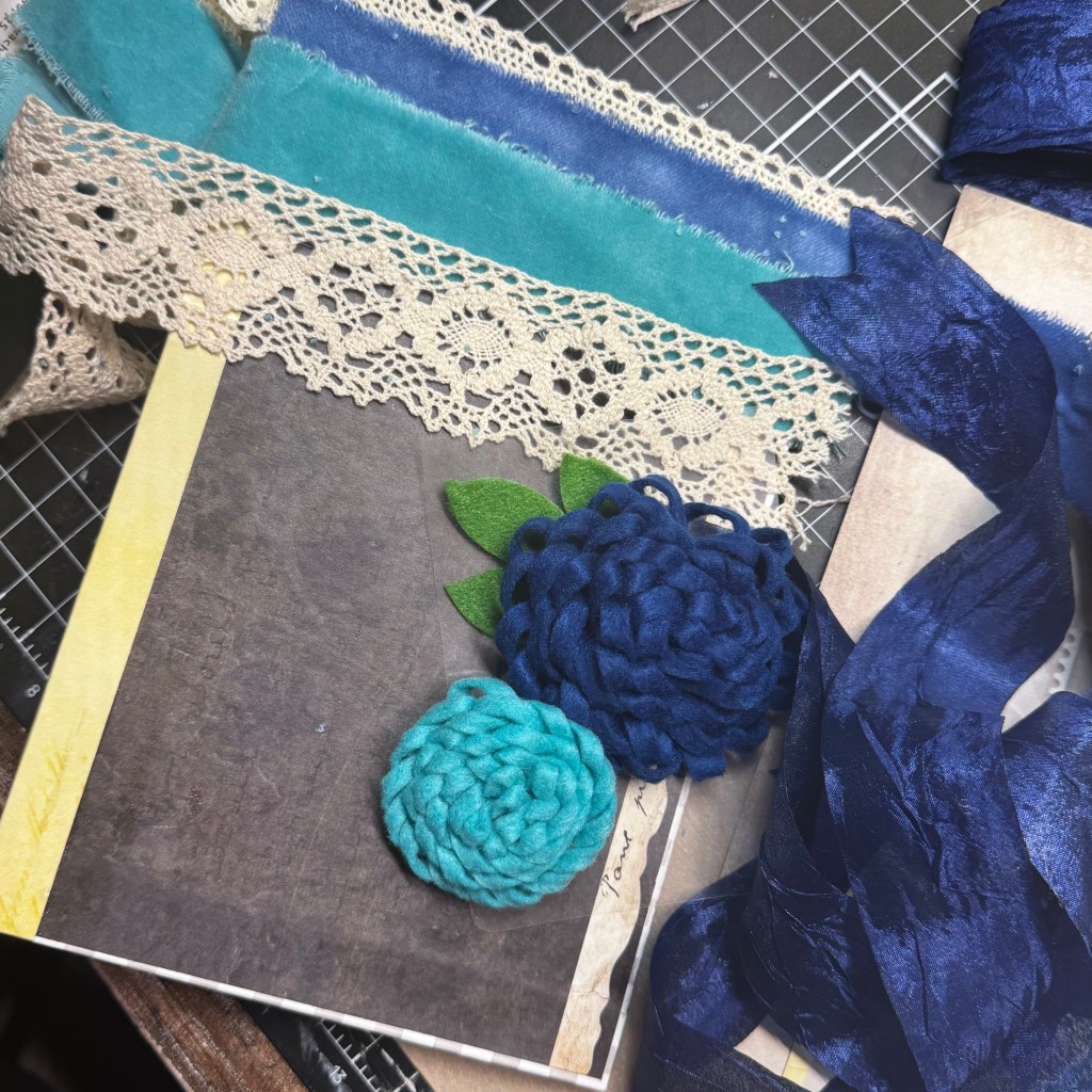 One by one, I added the ribbons. I did end up deciding not to add the lace to the front cover at all. I loved the way that the blues looked together. I overlapped them jut a bit, being sure to secure all the edges. I even created a bit of a “lip” as I was doing this, so I went with it! I loved the raised edges and loved the final result!