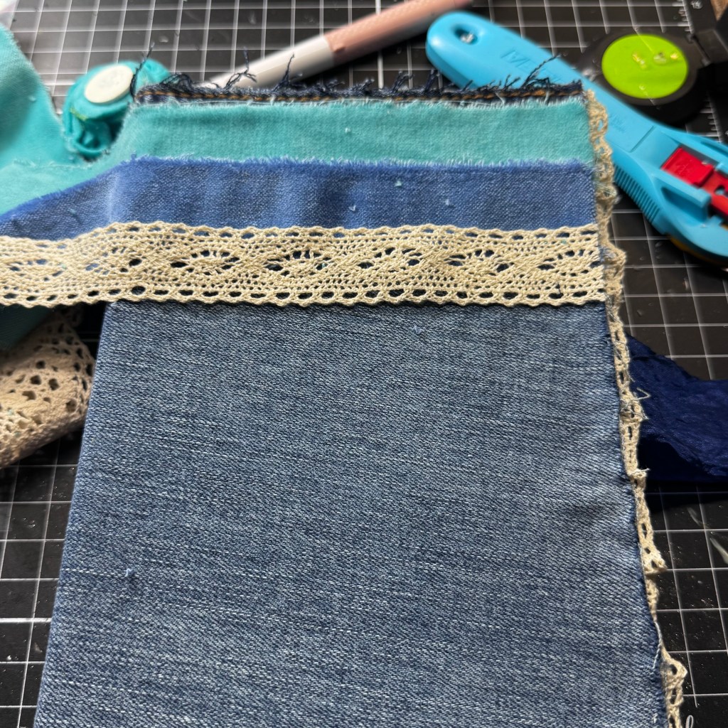 Well, I realized that the ribbon and lace alone would not achieve the look I had envisioned, nor would it completely cover all the yellow and black in the cardstock that I chose. SOOOO…I grabbad an old pair of jeans and started cutting! The denim would be perfect to compliment my ribbons, and I could fray the edges to give the final cover a vintage vibe!