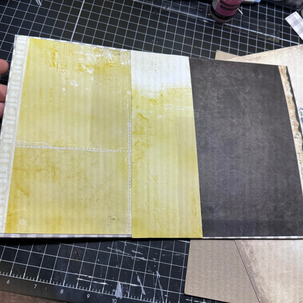 The outside of the journal cover was a different story. I knew that I would be completely covering it with ribbons and materials, so I didn’t care what color cardstock I used. However, I did make sure that it was a super thick~ high quality cardstock, because those seem to work better in my opinion. Here is what the outside cover looked like once the first layer was complete. Remember, this is all getting covered up, so the important thing here was to choose the best quality base for my Journal Cover.