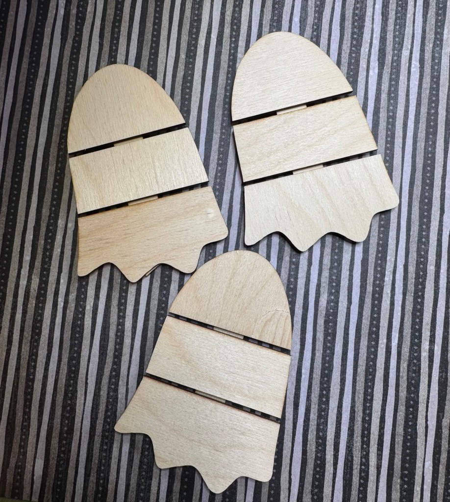 First, I traced each ghost shape onto my patterned paper to create a base layer. For my version, I chose to cover the entire piece—so I didn’t cut around the individual shiplap lines. Once traced, I cut them out and adhered the paper directly to the wooden ghost using craft glue. To get crisp, clean edges, I carefully trimmed around the shape with my trusty X-Acto knife.
