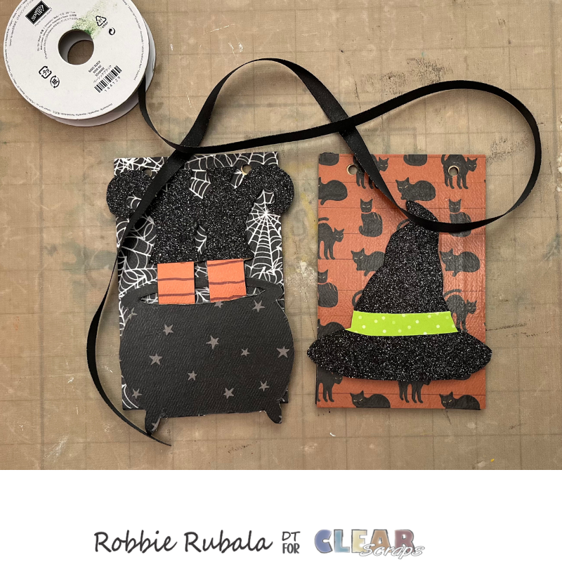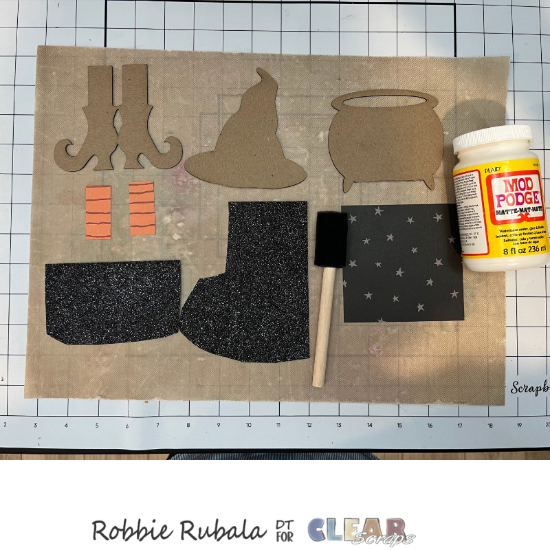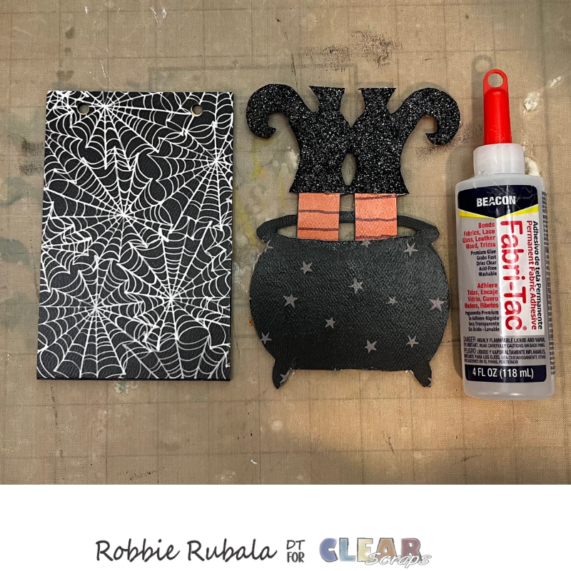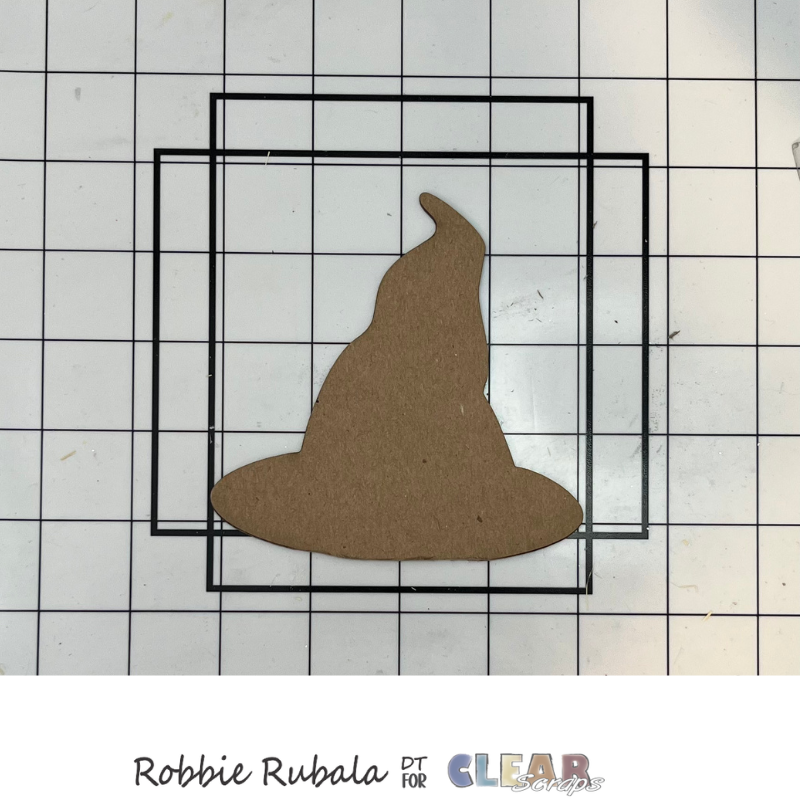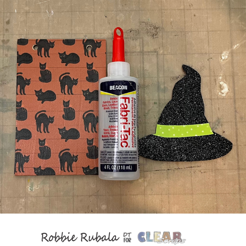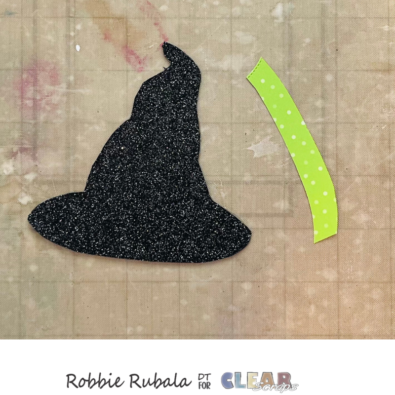 Use a piece of pattern paper and cut a curve to make the band for the witch’s hat. Use a strong glue to attach the paper to the hat. Let dry completely. When dry use your craft knife to trim the sides.