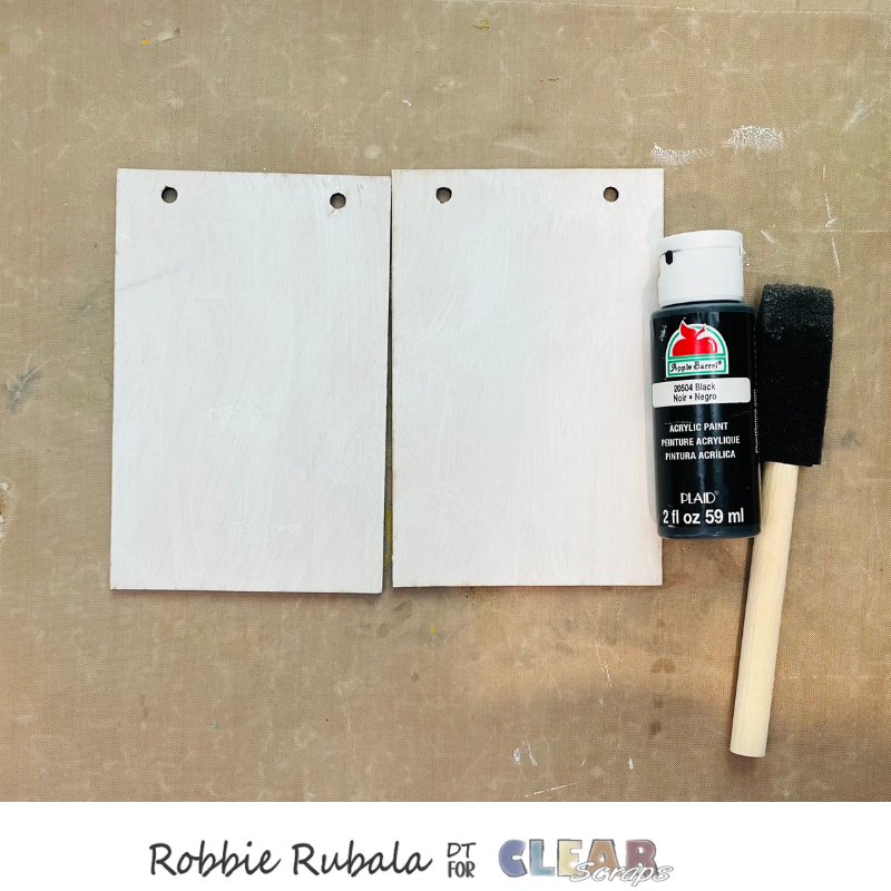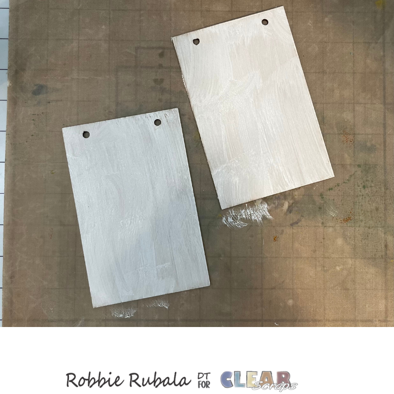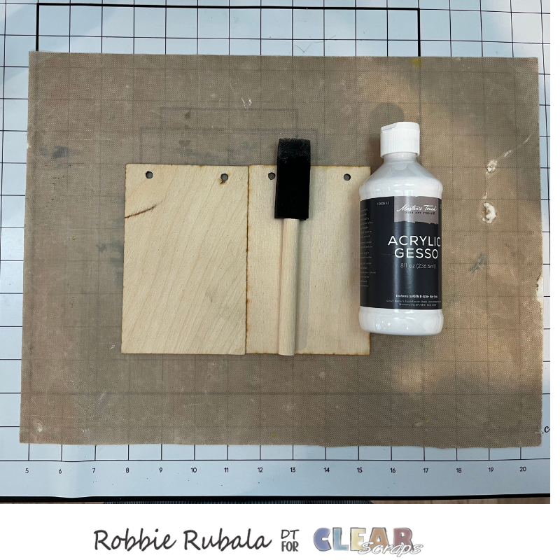 To begin take your Gesso and paint sponge and paint the wood cards. Let dry completely.