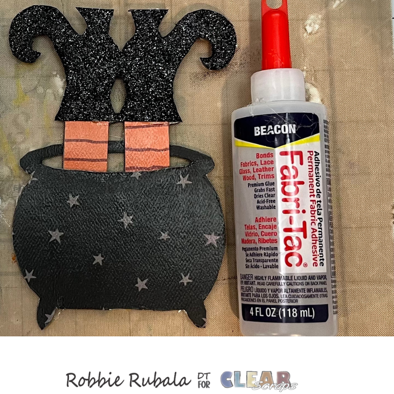 Insert the witch’s legs into the cauldron. Use a strong glue to glue them in place. Add a heavy blog on top to ensure the legs stay attached to the back of the cauldron.