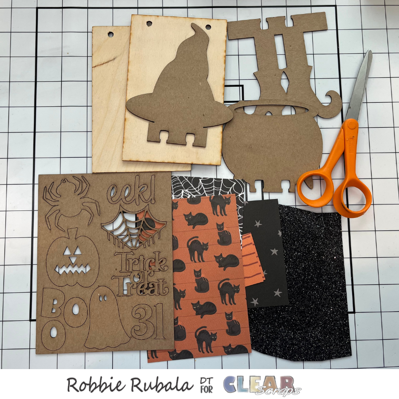 To make your wall decor hangers you will need blank wood card, Spooky Memory-Dex dividers, Halloween pattern paper, black glitter paper, black glitter ribbon, Gesso, white acrylic paint, Mod Podge, craft knife, hole punch, pencil, ruler, paint sponge, sand paper, and scissors. The Halloween punch out embellishments were not used.
