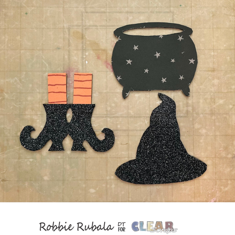 We are now doing to remove the memory-dex holes on the 3 spooky dividers. Use a ruler, craft knife and pencil to draw lines at the bottom of the witch’s legs just above the memory-dex holes. Use your ruler and craft knife to cut off the memory-dex holes leaving just the legs and shoes.