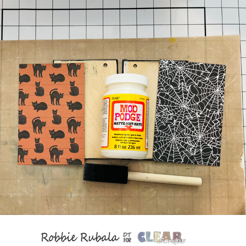 Take your Mod Podge, Halloween pattern paper, and paint sponge. Add Mod Podge to one of the wood cards. Place the pattern paper onto the wood card making sure to match up the holes. Set aside to dry. Repeat the steps with the other wood card and pattern paper. Let both dry completely.