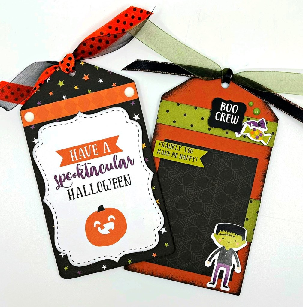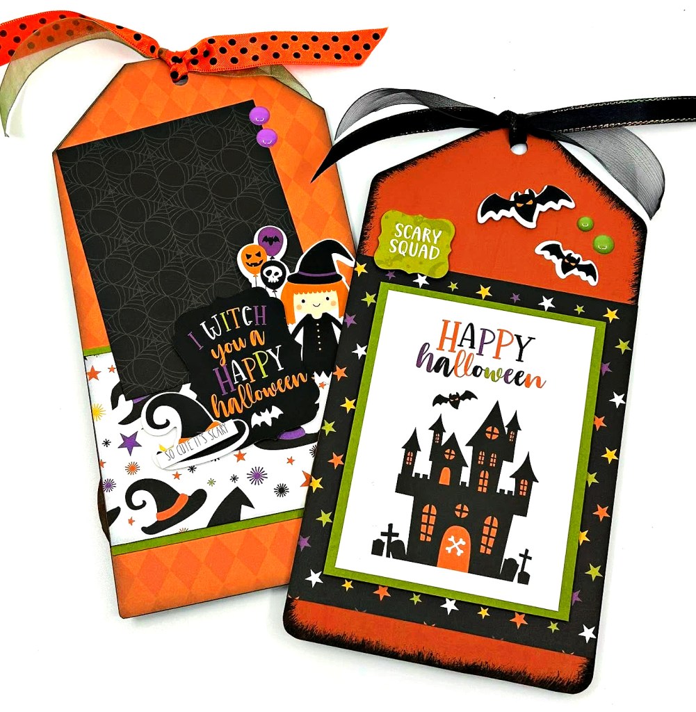 More spooky fun on the back of these tags too! So simple to layer up some papers and stickers. And don’t forget the finishing touches like enamel dots and pretty coordinating ribbons!