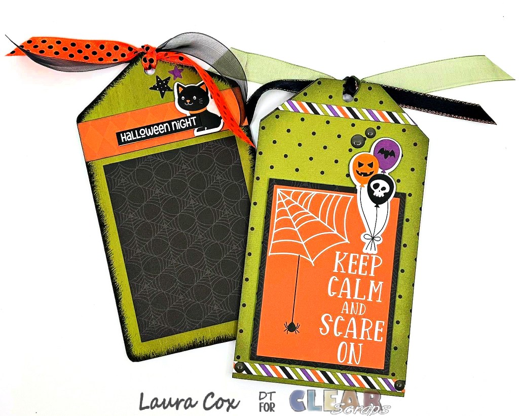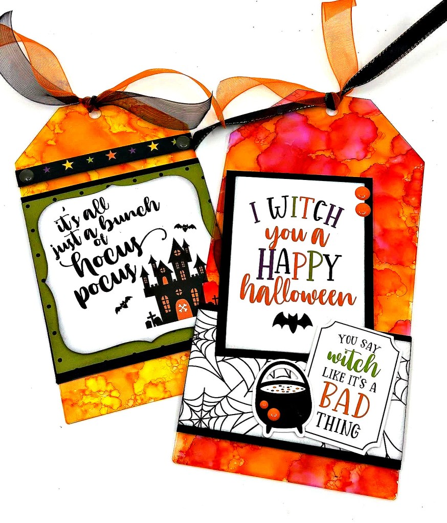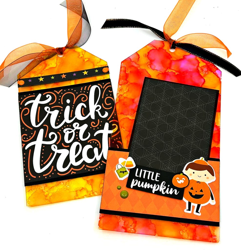 To really mix it up, I also used the acrylic tags! This is the Clear Scraps Acrylic Pentagon Tag, and also the Acrylic Angle #10 Tags. It’s great to use different sizes and shapes to make the tag box more interesting! These were colored with alcohol inks in orange, red and yellow. Just dab onto the acrylic using a felt pad and you get a Halloween perfect look! Then decorate with papers and stickers.