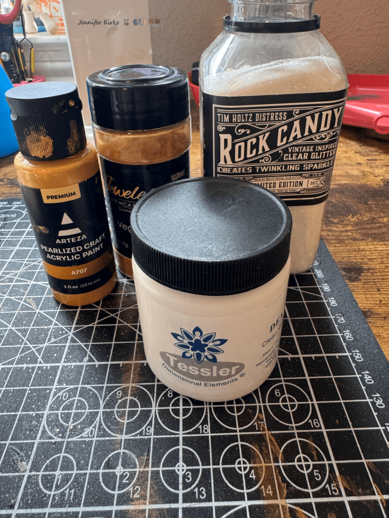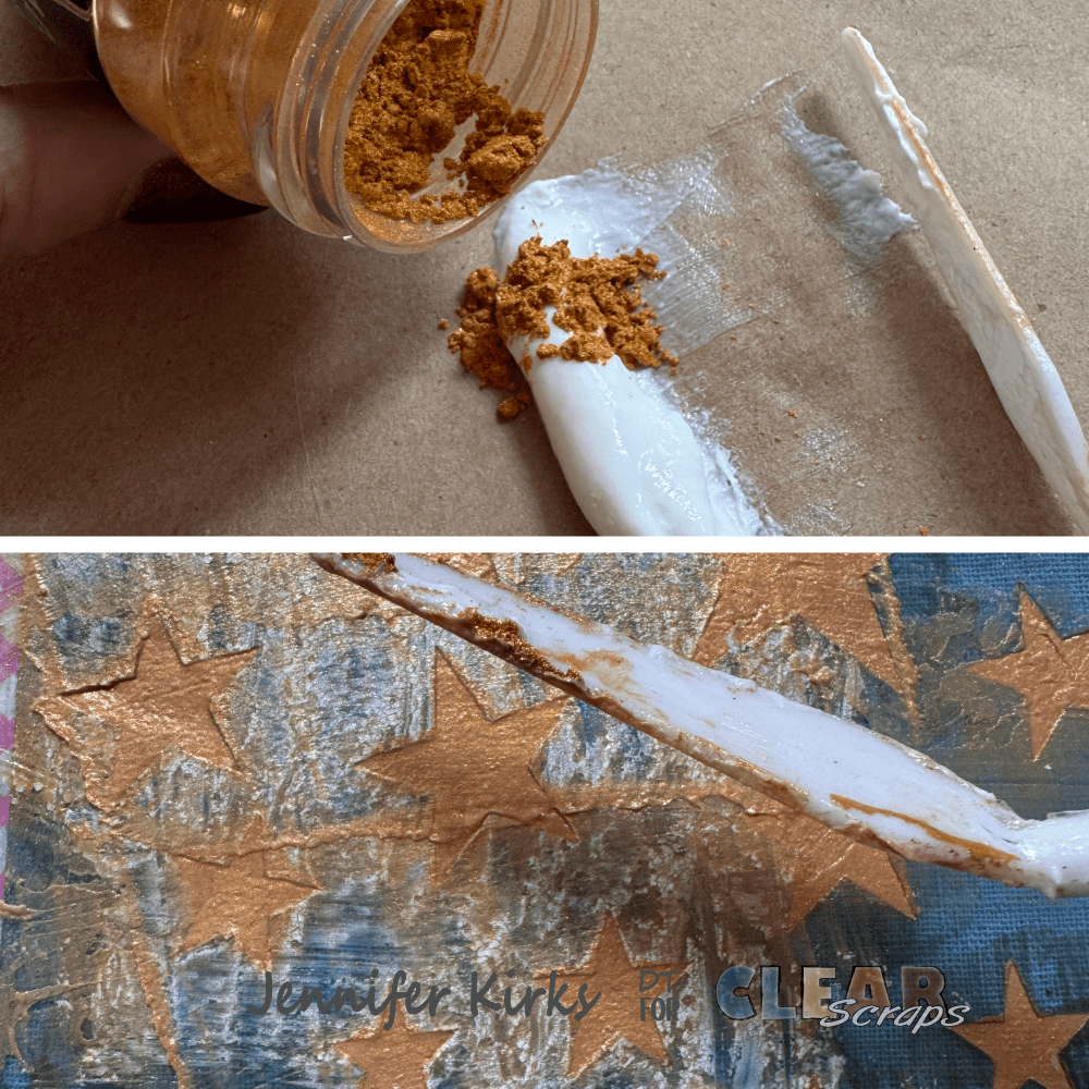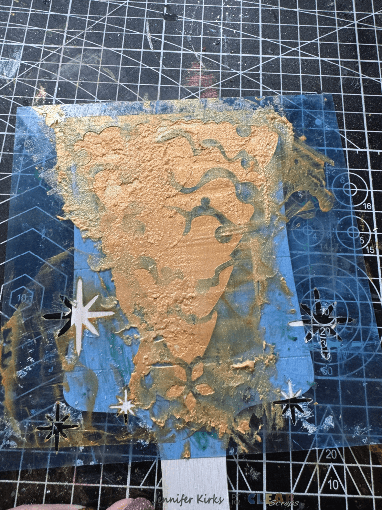Next, I mixed a bit of glossy gel medium with some rich gold paint to create a smooth, shimmery texture. Using my trusty spatula, I carefully spread the mixture over the stencil. A little tip: go gently when applying over a stencil — pressing too hard can cause it to lift and smudge (and believe me, I’ve made plenty of “happy accidents” learning that one!).